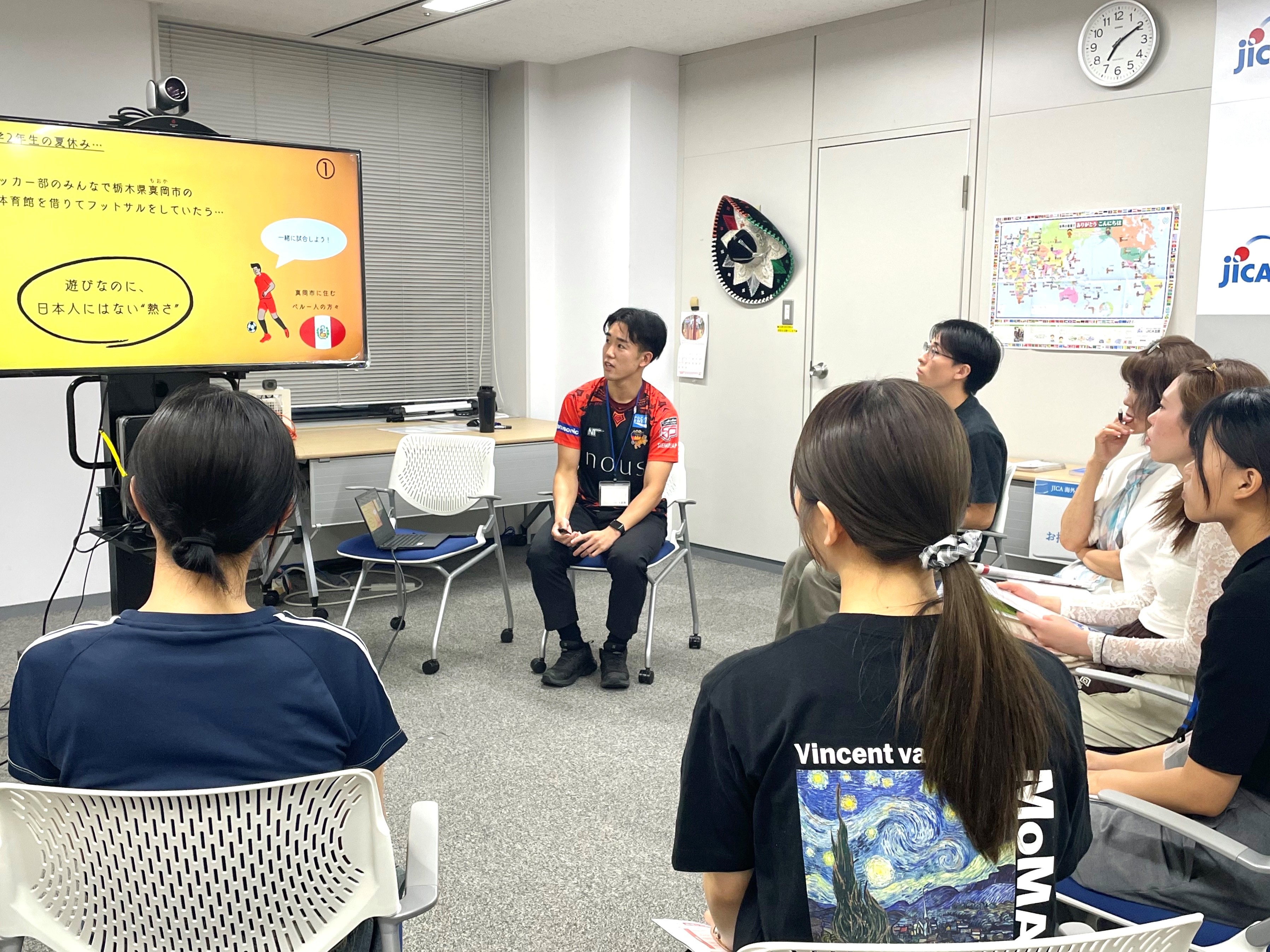 話の中で、応募に至ったきっかけや、派遣国での生活、活動の様子などを紹介。さらに「応募する前に知りたい5つのコト」と題してJICA海外協力隊の制度や待遇、サポート体制についても、現地での体験を交えながら説明しました。