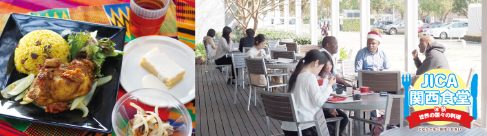 JICA関西1階の食堂は、どなたでもご利用になれます。大好評のエスニック料理を中心に、ハラルに配慮した食事や日替わりの定食なども用意しています。