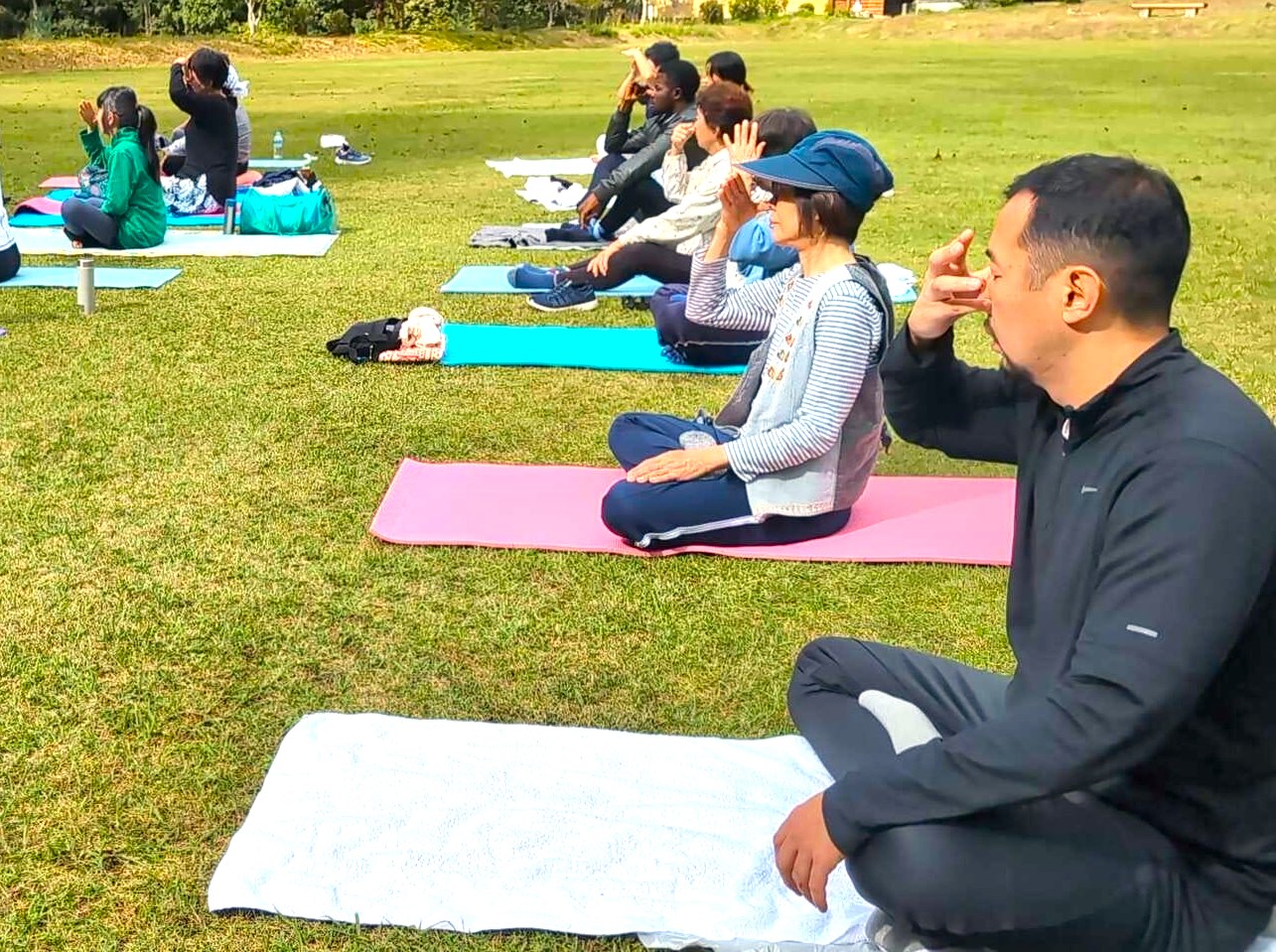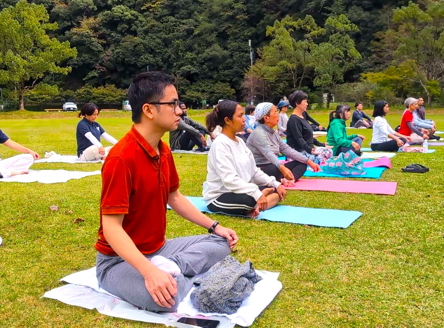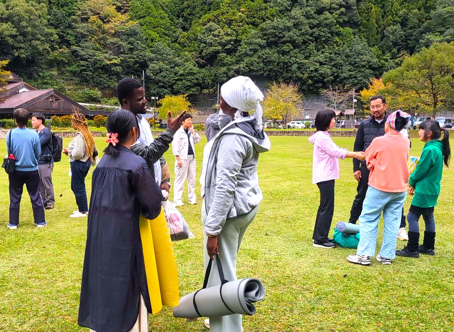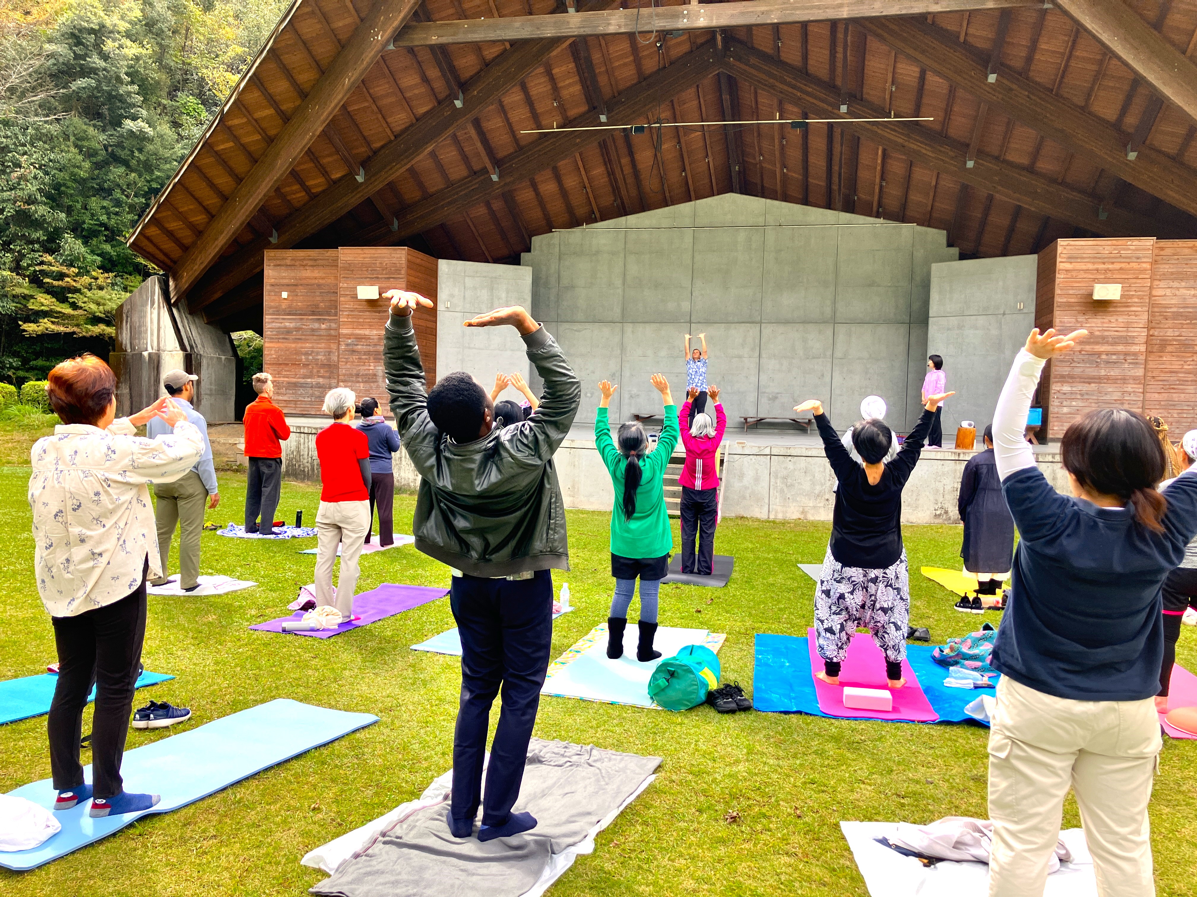 ネパール出身のJICA留学生が提案したヨガ企画を実現し、村民の皆さんも約15名が参加。自然の中でのヨガは国際交流の場としても意義ある機会となりました。