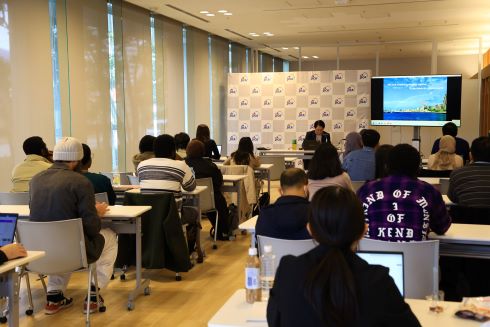 午後の部では、DRLC(国際防災研修センター)(注2)による講義と、防災をテーマにしたグループワークが行われました。最初に、DRLCの担当者から、国内外でJICAが取り組む防災事業について紹介があり、各国の災害リスクに応じた支援の仕組みや、防災力向上に向けた協働の重要性などが紹介されました。講義中には、留学生から自国でのJICAの具体的な活動内容について多くの質問が寄せられ、活発な意見交換が行われました。
