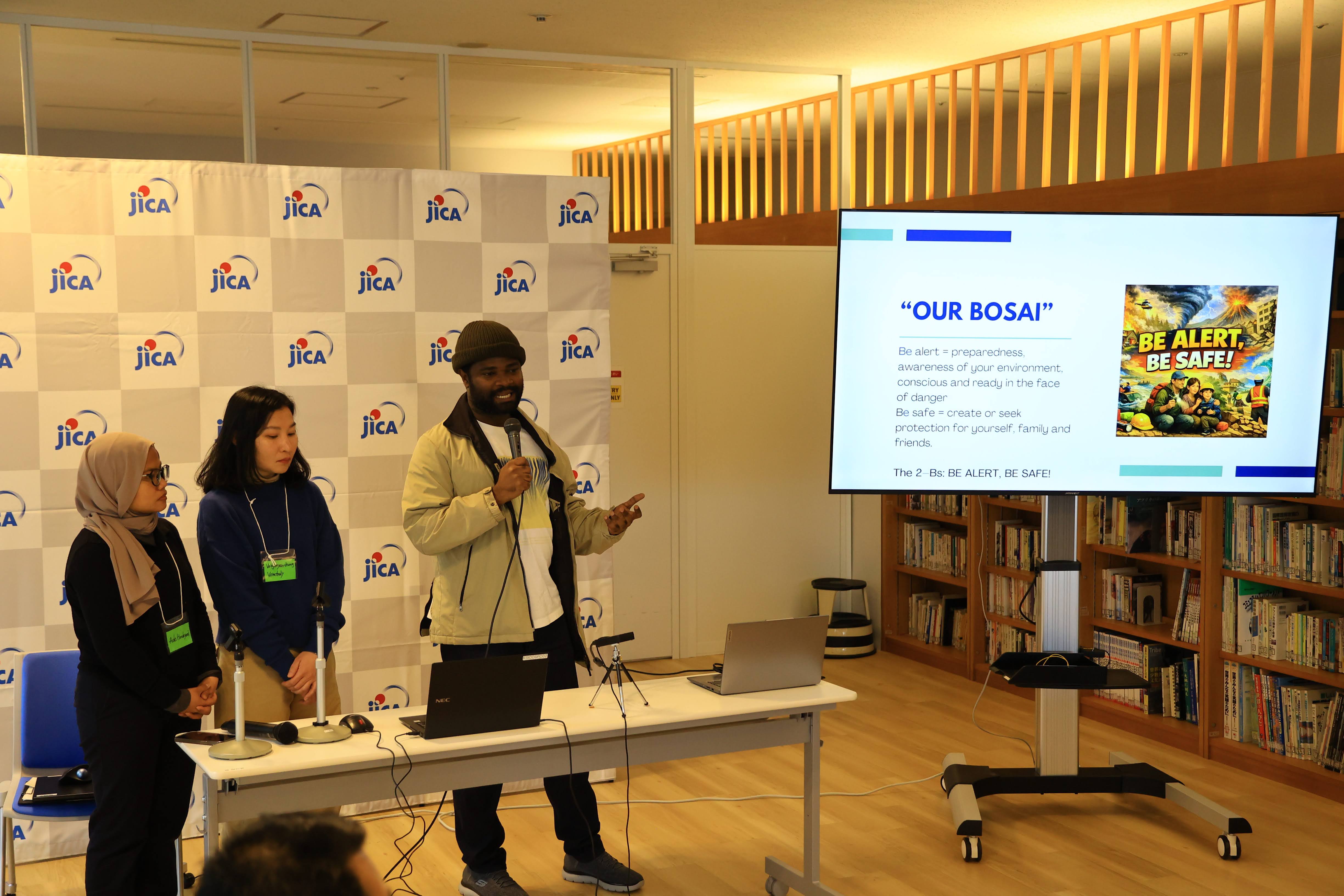 最優秀作品に選ばれたのは、“Be alert, Be safe”。「備えることが自分を、家族を、そして大切な人を守る」という防災の本質が端的に込められたキャッチコピーであり、そのメッセージ性が高く評価されました。この“Be alert, Be safe”は、今後JICA関西における防災教育のキャッチコピーとして活用される予定です。