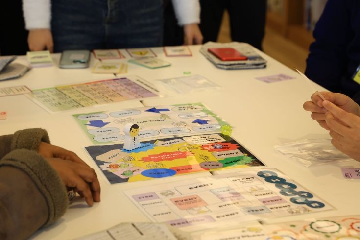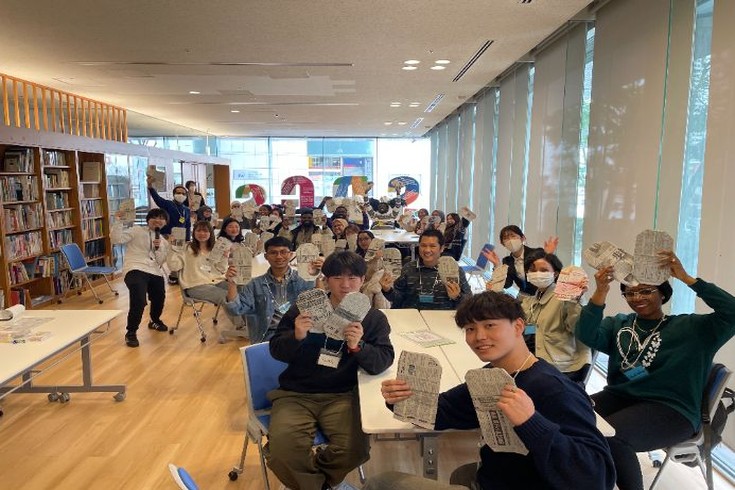 京都学生FAST(Fire And Safety Team)(注1) による防災ワークショップでは、新聞紙で防災スリッパを作成した後、防災ボードゲーム “Choice” の実践を行いました。新聞紙スリッパの製作では、身近な材料を使って安全を確保する工夫を体験し、防災を日常の延長線上にあるものとして捉えるきっかけとなりました。ボードゲームでは、災害発生時・避難所生活・復興期などの場面を想定し、クイズを交えながら留学生同士が意見交換を行い、自分たちなりの判断を導き出す姿が見られました。