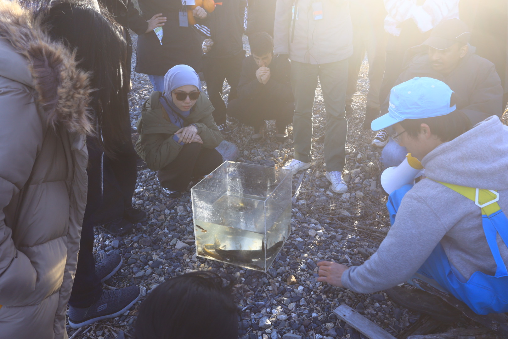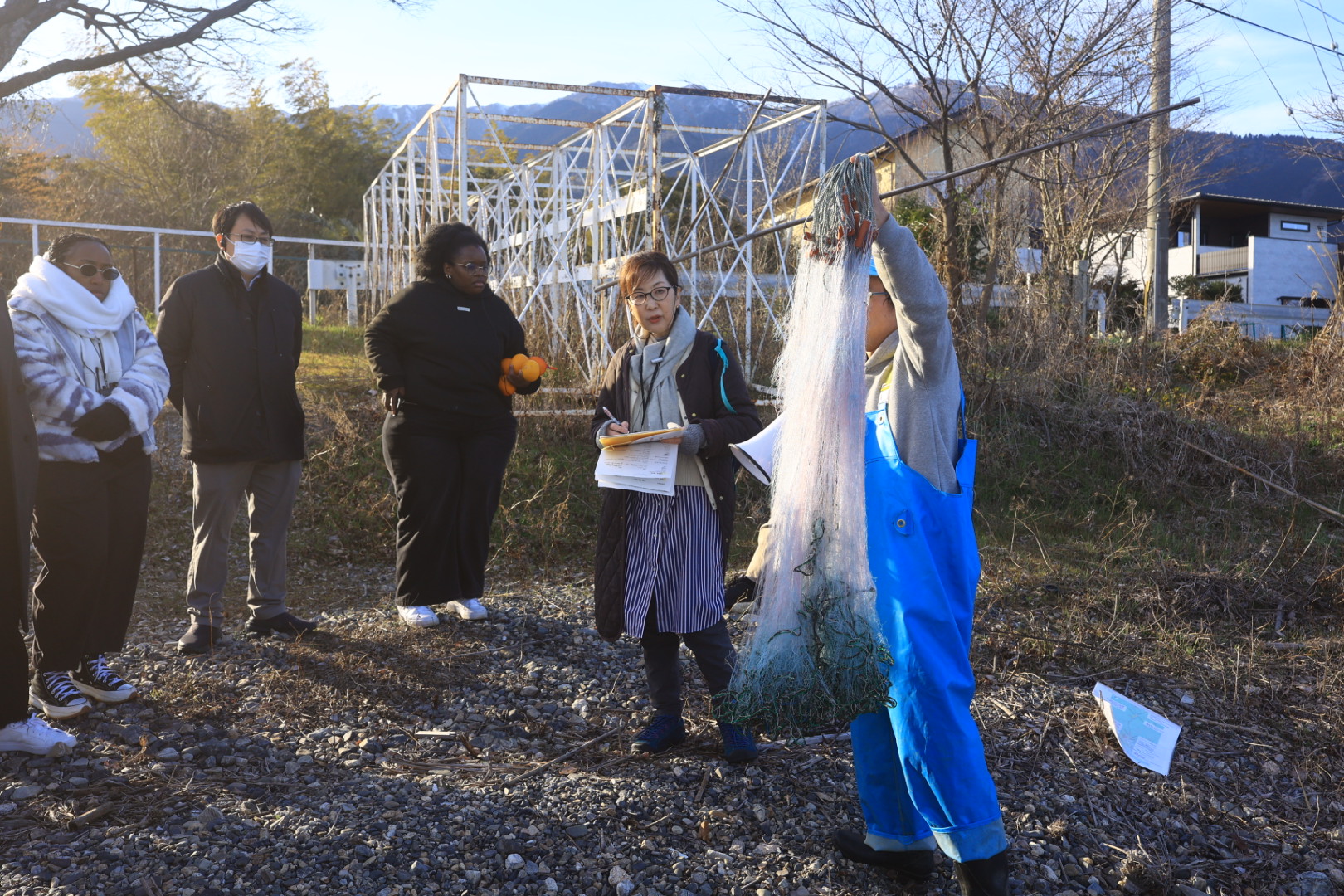 ・湖岸で漁師から学ぶ:漁具や釣りあげた魚を見せていただきながら、伝統漁法「えり漁」、琵琶湖で暮らす人々の生活への理解を深めました。