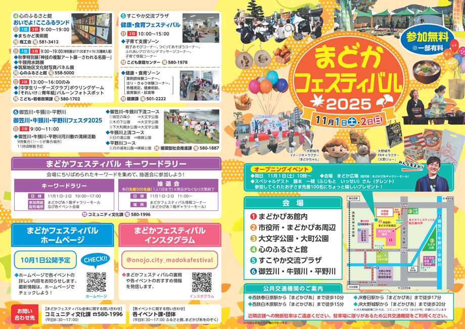 大野城市秋の一大イベント「まどかフェスティバル2025」が11月1日(土)、2日(日)に開催されます。さまざまな団体の活動発表や展示、飲食ブースの出店やステージイベントなどが行われる予定です。
