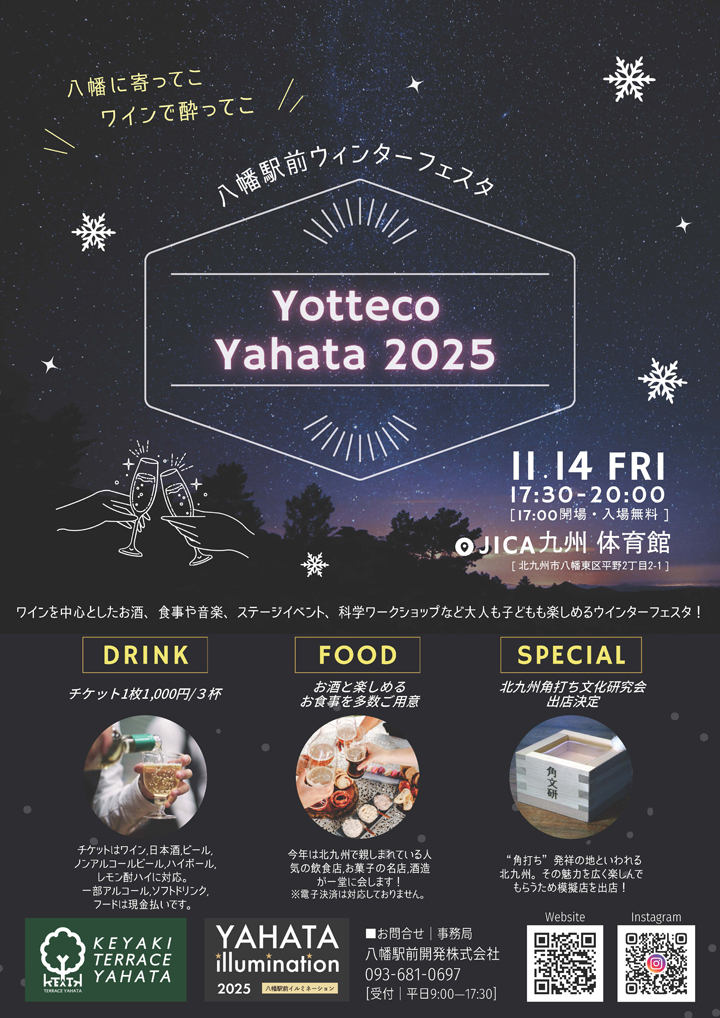 2025年11月14日(金)17:30からJICA九州体育館で、「八幡駅前ウィンターフェスタ2025 Yotteco Yahata」が開催されます。