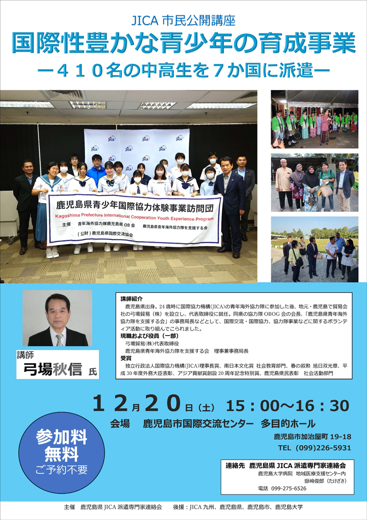 今回は弓場貿易(株)代表取締役、鹿児島県青年海外協力隊を支援する会 理事兼事務局長である弓場秋信氏による講演です。