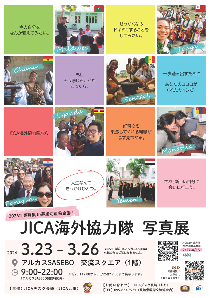 3/23(月)~3/26(木)佐世保市のアルカスSASEBOで、JICA海外協力隊の活動をご紹介する写真展を開催します。