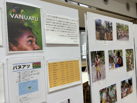 また、JICA海外協力隊としてバヌアツで活動した3人の元隊員が撮りためた現地の写真や、民芸品などを通してバヌアツを紹介するコーナーも設けられました。ご来場いただいた方は、まず「バヌアツってどこにあるの?」から始まり、元隊員が世界地図で位置を示しつつ、バヌアツへの熱い想いを語っていました。宮崎の方々にバヌアツを知ってもらい、関心を寄せて頂くきっかけを提供することができたように思います。