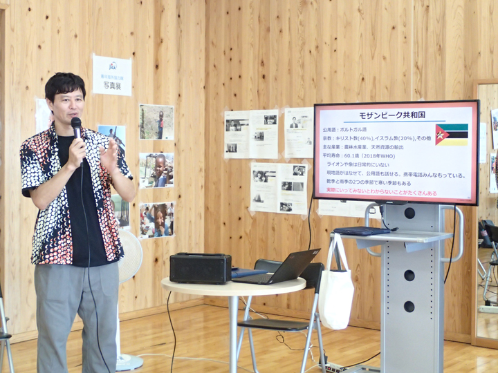 また、JICA海外協力隊の体験談発表では、アフリカのモザンビークにコンピュータ技術の職種で派遣されていた垣迫雄斗(かきさこゆうと)さんが、任国の概要やJICA海外協力隊に参加したきっかけ、実際に派遣された農業大学校でのコンピュータを使ってのデータ管理の仕事の内容などを、座談会形式でざっくばらんにお話ししました。「パソコンが直ったり、情報を管理できるようになったりしたときに、魔法を使ったかのように驚いてくれて感謝してくれたこと」と、自分のできることで現地の人の役に立てたことが一番印象的な経験だったと話す垣迫さんの体験談に、集まった生徒、先生方は真剣に聞き入っていました。垣迫さんが活動していた場所の近くに住んでいた子どもに、サッカーボールをプレゼントしたが、空気が抜けてやがて使われなくなったという体験から、「現地の人が継続的に自分たちでより良くしていくには、何かを与えるだけでよいのだろうか?どのように支援したらよいのだろう?」と、みなさんに語りかけました。「ピーンと来たことにチャレンジしてみよう。後悔しても次へのステップになる」「JICA海外協力隊は、現地の人と一番近い存在で国際協力ができる良さがある」と生徒たちに伝え、文化祭の一幕を飾りました。