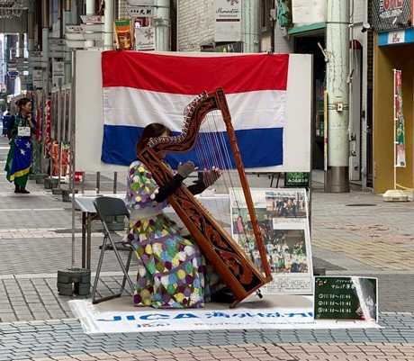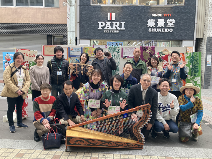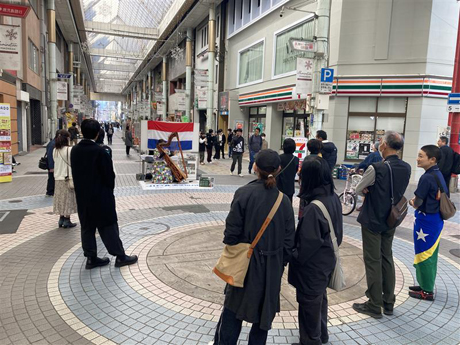青年海外協力隊鹿児島県OB会と共催で開催した今回のイベントは、鹿児島県から出発した隊員の活動紹介パネルや、高校生・大学生によるインタビュー記事の展示の他、世界のあいさつなどを探すミニゲームや、缶バッジ作りなど、盛りだくさんの内容となりました。特に、元パラグアイ隊員の木原さんによる演奏会では、伝統楽器アルパの音色に足を止めて聴き入る方もいらっしゃり、天文館のアーケード内にやさしい音色が響きました。