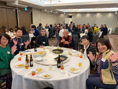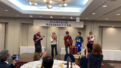 夕方からは、青年海外協力隊鹿児島県OB会主催のJICA海外協力隊60周年発足記念交流会が催され、鹿児島県出身の約60名の協力隊経験者が集う賑やかな会となりました。中には、10年ぶりにOB会の集まりに参加された方もいらっしゃり、久々の再会に抱き合う姿も見られました。南米の元隊員で結成された音楽隊「ロスポンチョス」による舞台演奏では、直近で帰国したばかりのフレッシュな隊員とのコラボもあり、大盛況な会となりました。参加した隊員の皆さんのお話を伺う中で、改めて60周年という歴史と意義を感じるとともに、隊員の原動力である「世界をより良くしたい」と願う気持ちは、今も昔も普遍的なものであると感じました。