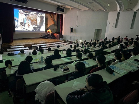 「地球のステージ」は、世界各国の紛争地域等で命に向き合ってきた医師の桑山紀彦氏を案内役に、ライブ音楽と大画面の映像・スライドと語りを組み合わせた非営利コンサートステージです。JICA九州と熊本県立大学の共催で行われた本公演は、今年で3回目。足元の悪い中100人を超える方々が訪れました。