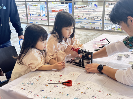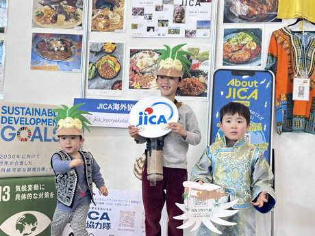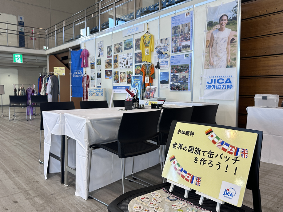ブースでは、JICA海外協力隊の活動を紹介するパネル展示のほか、世界の国の言葉でつくるオリジナル缶バッジ作り体験、民族衣装の試着コーナーなどを実施しました。