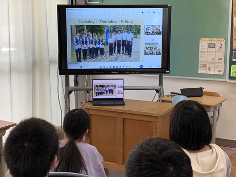 お互いの言語での自己紹介から始まり、自分たちの学校の紹介や、日々の学校生活を写真で説明するなどして、学校の「同じ」と「違い」を知る機会になりました。