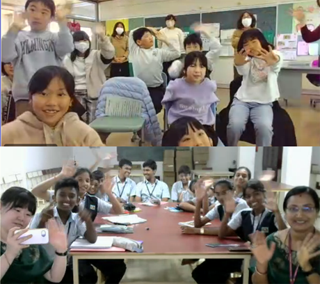 交流を行ったのは、銭座小学校の4年生9名と、インドに派遣中の本山晶隊員(職種:日本語教育)の配置先であるスリ・サンカラ学校で日本語を学ぶ6年生から8年生の11名です。