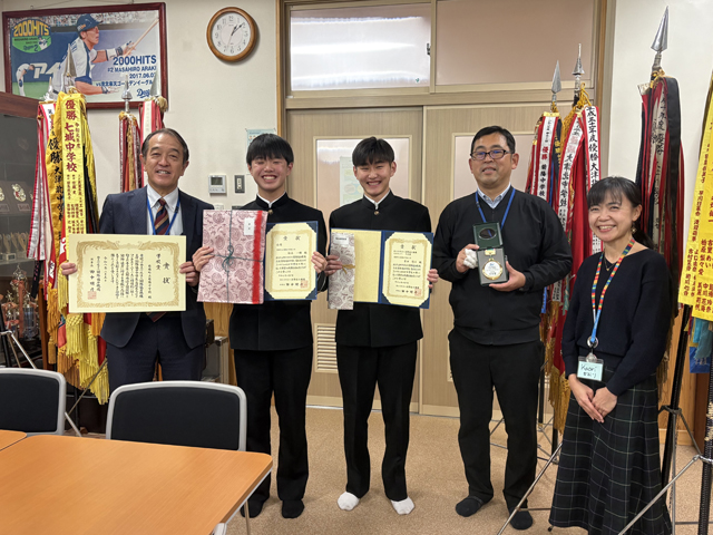 文徳中学校(左から小川先生、山下さん、大田さん、紫藤教頭先生)