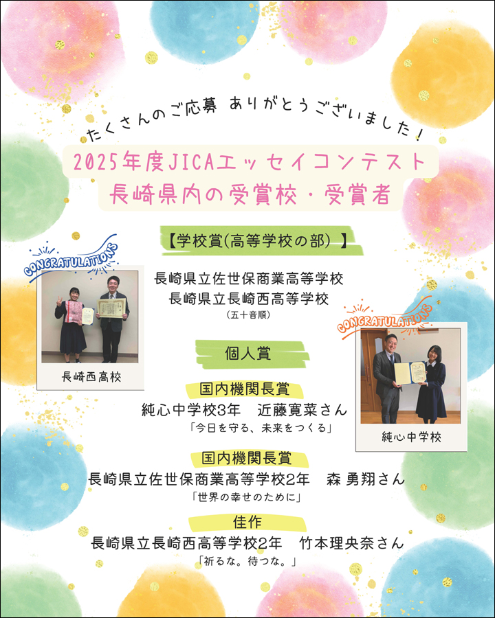 2025年度「JICA国際協力中学生・高校生エッセイコンテスト」が開催され、長崎県からも学校賞2校、個人賞を3名の方が受賞をされました!