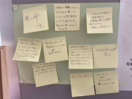 (ファトマへのメッセージを集めたボードには、ご来場の方々から、たくさんの感想が寄せられました。中には、JICA九州センターに滞在しながら日本の技術を学んでいるJICA研修員からのコメントもありました。)