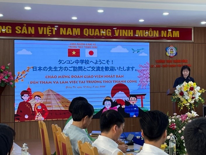 ハノイ市内の公立中学校での歓迎式典にて、チームリーダーとして挨拶を行う小林先生