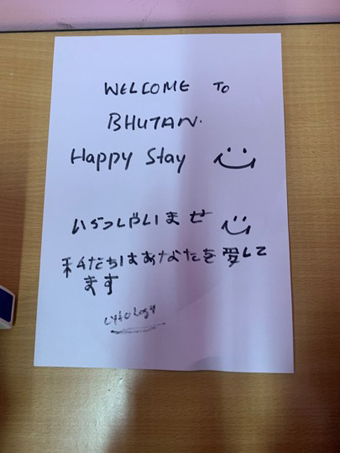 そのように語る新原さんは活動の中で、ブータン人の強さに気づいたと言います。医療予算の低下により課題も散見されるなかで、ブータンではなく、ほかの国で働くという選択もあるはず。しかしブータンの人々の「自分の国で頑張ろう」と前向きに、日々一生懸命働く姿を見て、すごい!と感動したそうです。この他にもブータン人の温かさや、強さが感じられるエピソードをたくさん話してくださいました。中でも特に印象に残っているのは、派遣初日の出来事だそうです。初めての環境で緊張していた新原さんを迎え入れたのは、新原さんのデスクに置いてあったブータン人の同僚たちからの「いらっしゃいませ。私たちはあなたを愛しています。」と日本語で書かれた手紙でした。新原さんはその手紙を見てブータン人のやさしさと愛に感動したそうです。着任したその日から現地の人々は、新原さんを一人の家族のように扱ってくれたため、新原さんも安心して活動ができたそうです。