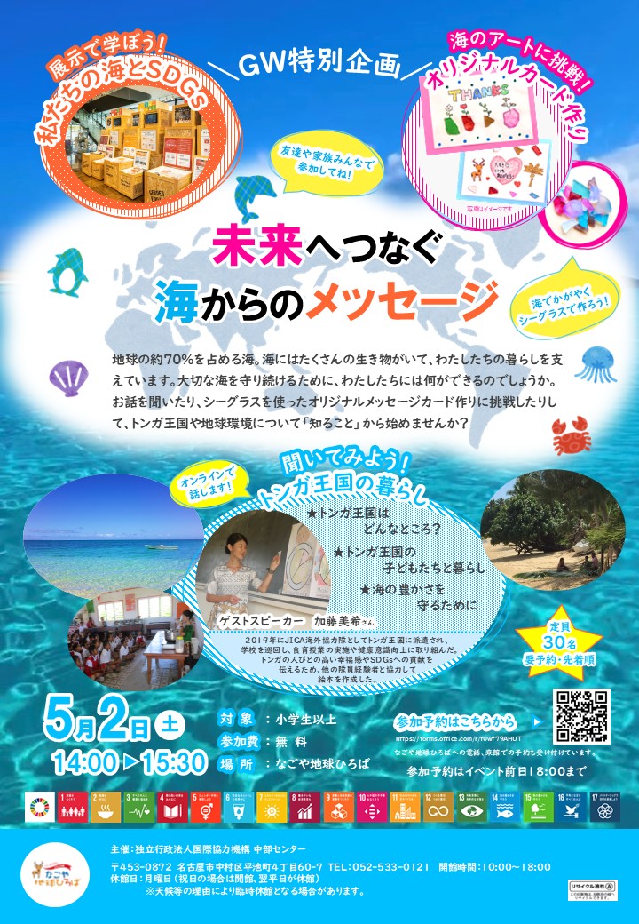 地球の約70%を占める海。海にはたくさんの生き物がいて、わたしたちの暮らしを支えています。大切な海を守り続けるために、わたしたちには何ができるのでしょうか。お話を聞いたり、シーグラスを使ったオリジナルメッセージカード作りに挑戦したりして、トンガ王国や地球環境について「知ること」から始めませんか?