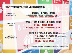 4月のなごや地球ひろばは以下のとおり時間を短縮して開館しております。ご理解のほど、よろしくお願いいたします。