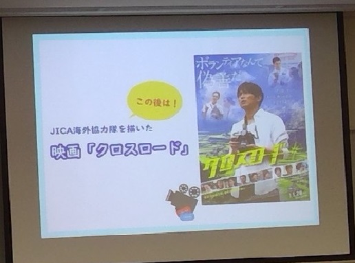 次に、映画「クロスロード」を上映しました。二人のJICA海外協力隊員が、それぞれ悩みながらも現地の人々との交流や活動を通じ成長していくストーリーで、映画を通してJICA海外協力隊の活動を垣間見ることができました。