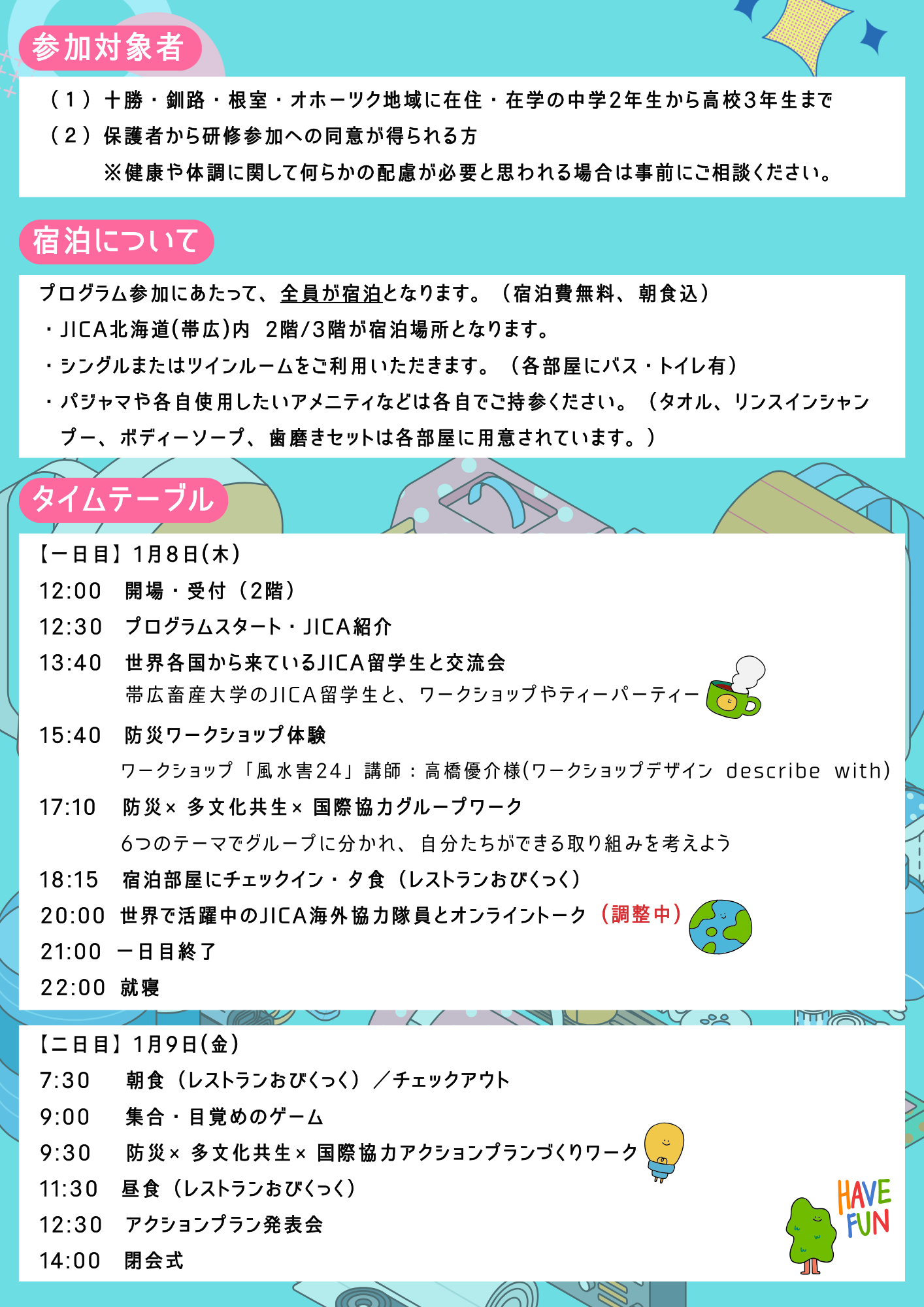 「未来をつなぐ 多文化共生と防災から学ぶ国際協力」をテーマに、帯広で暮らすJICA留学生との交流や、防災に関する「風水害24ワークショップ」の体験、夜は世界で活躍中のJICA海外協力隊員とオンライントークなど、様々な角度から国際協力を体験できるプログラムが盛りだくさんです。