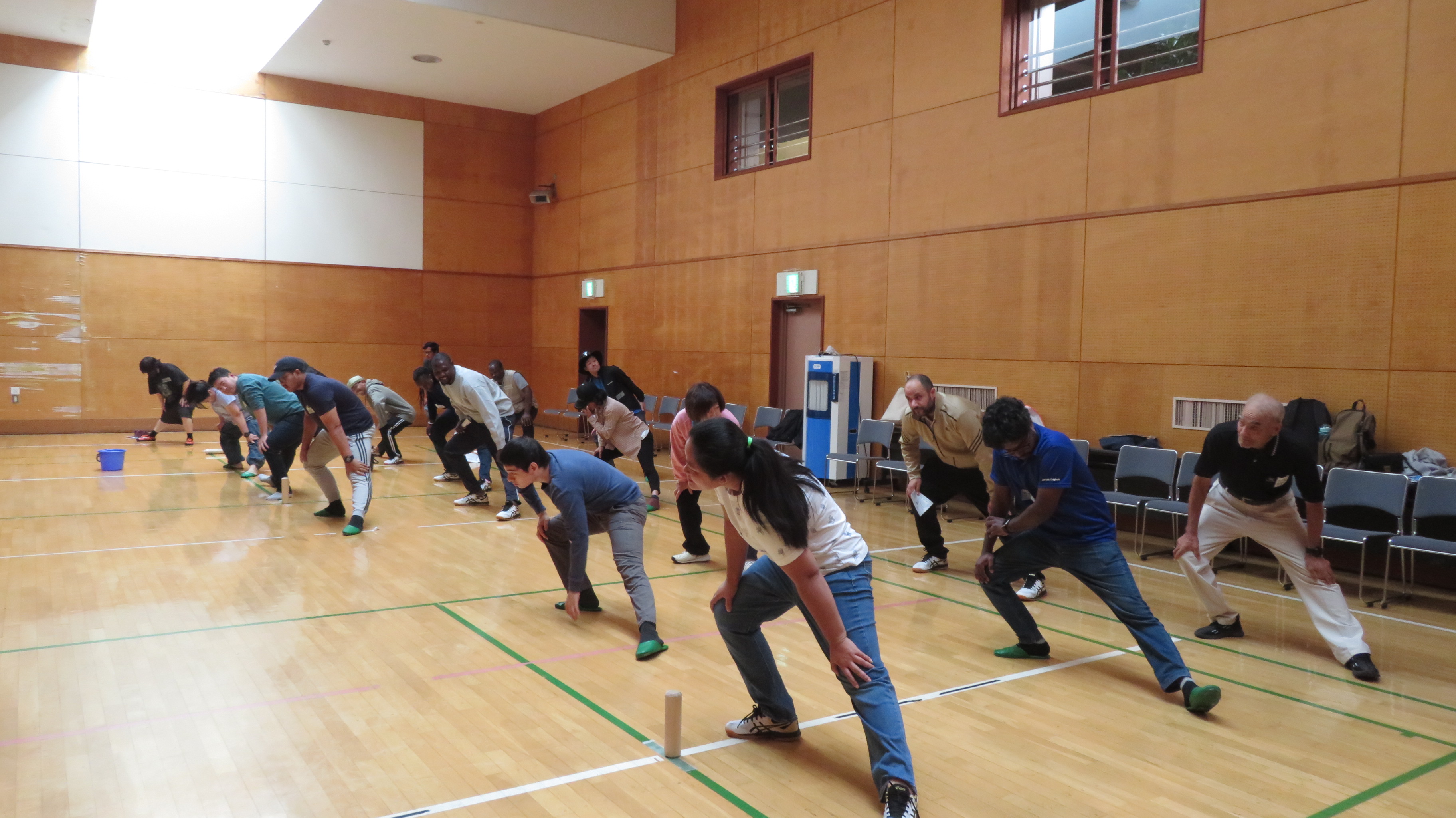 当初は屋外でのパークゴルフを予定していましたが、あいにくの雨天のため、急きょ屋内でのモルック大会に変更して開催されました。モルックはフィンランド発祥のスポーツで、木製のピンに向かって棒を投げ、得点を競うシンプルなルールのゲームです。年齢や体力に関係なく誰でも楽しめるため、研修員たちもすぐにルールを覚え、リラックスした雰囲気の中でプレーを楽しんでいました。