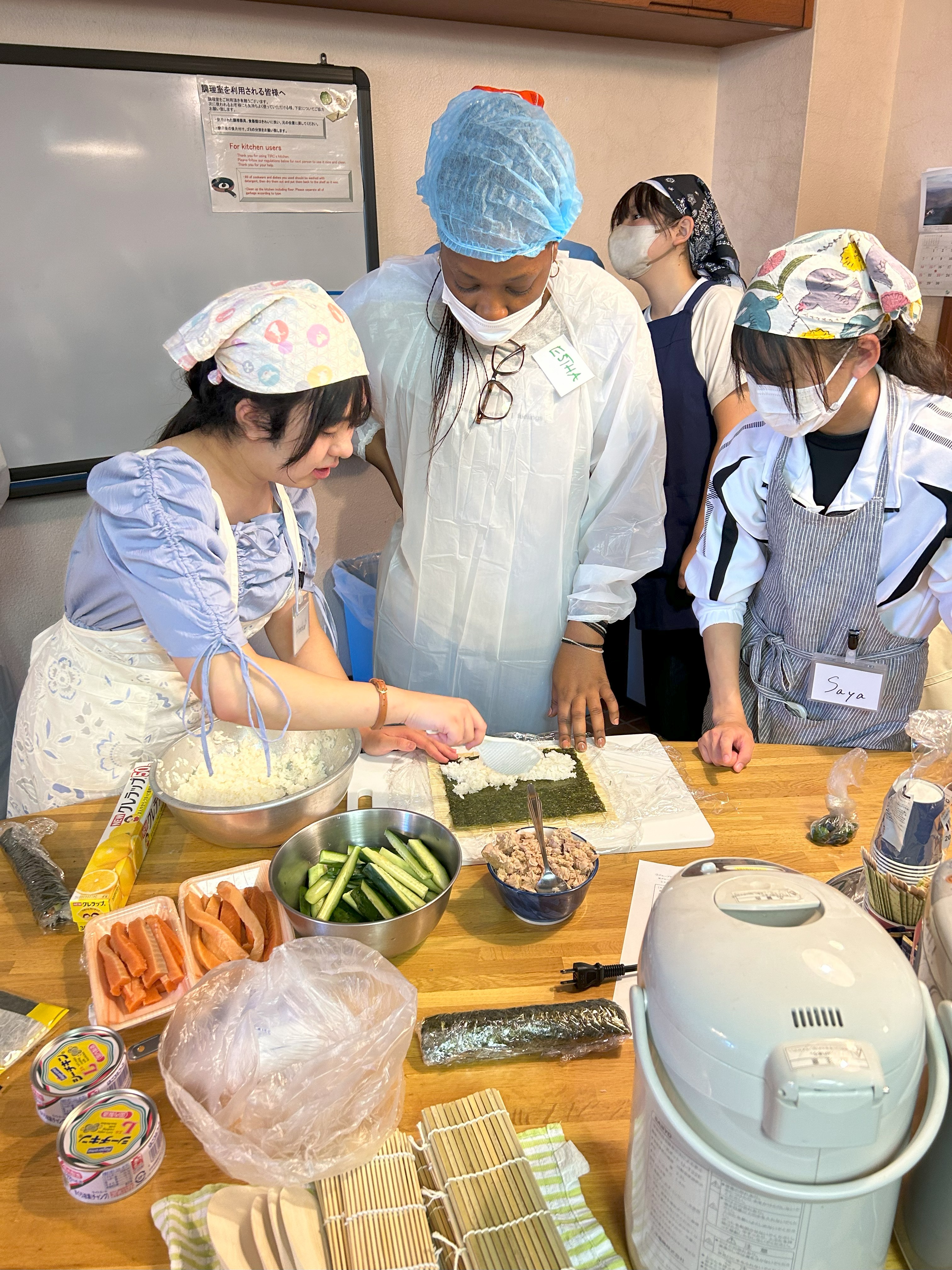 当日は、日本の家庭料理を代表する巻きずしとみそ汁をテーマに、生徒たちが英語で作り方を説明しながら、研修員と一緒に楽しく調理を行いました。