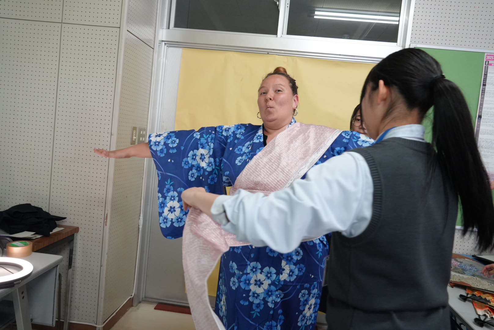 日本の学校の制服を体験し、嬉しそうな様子でした。