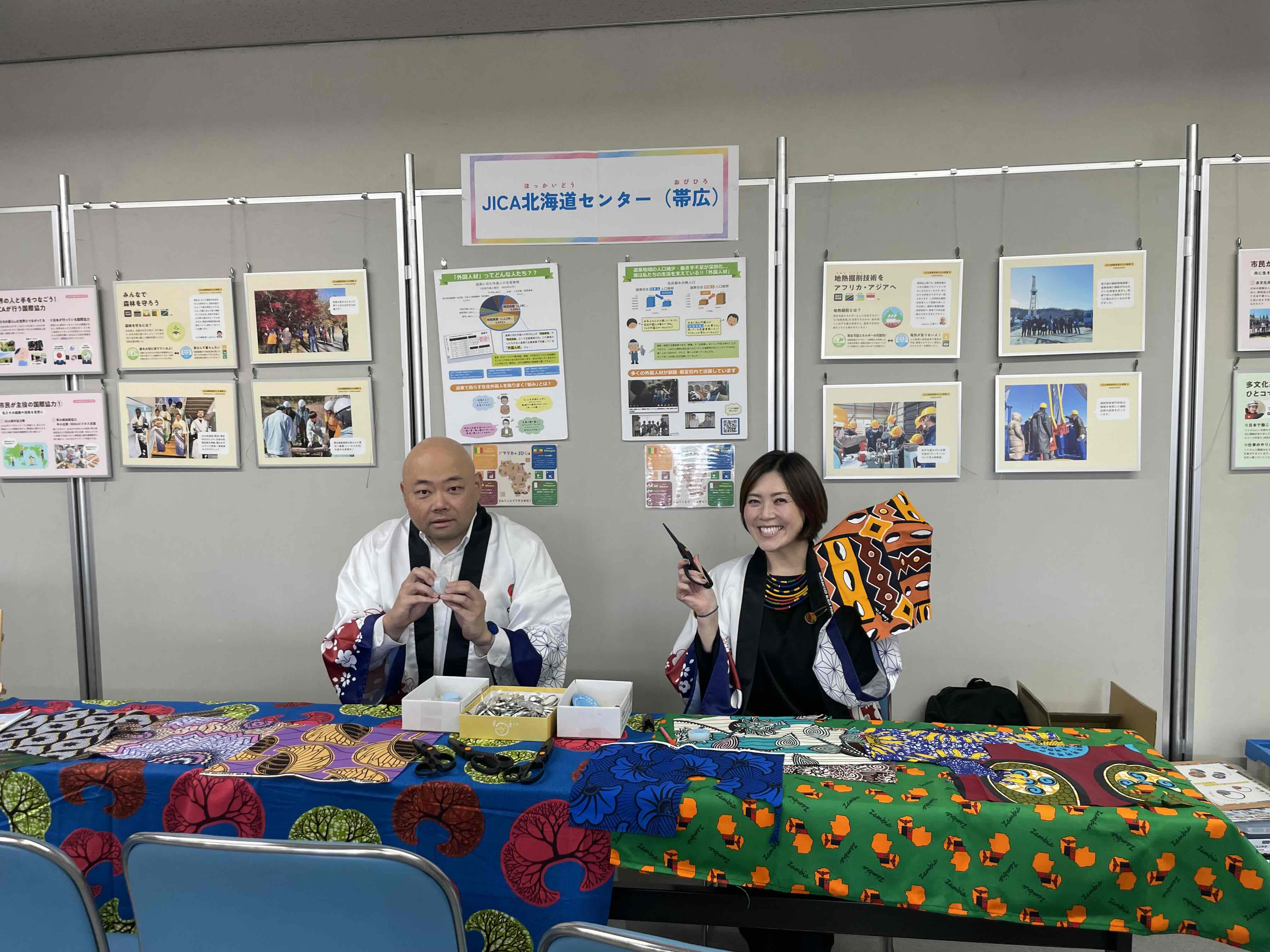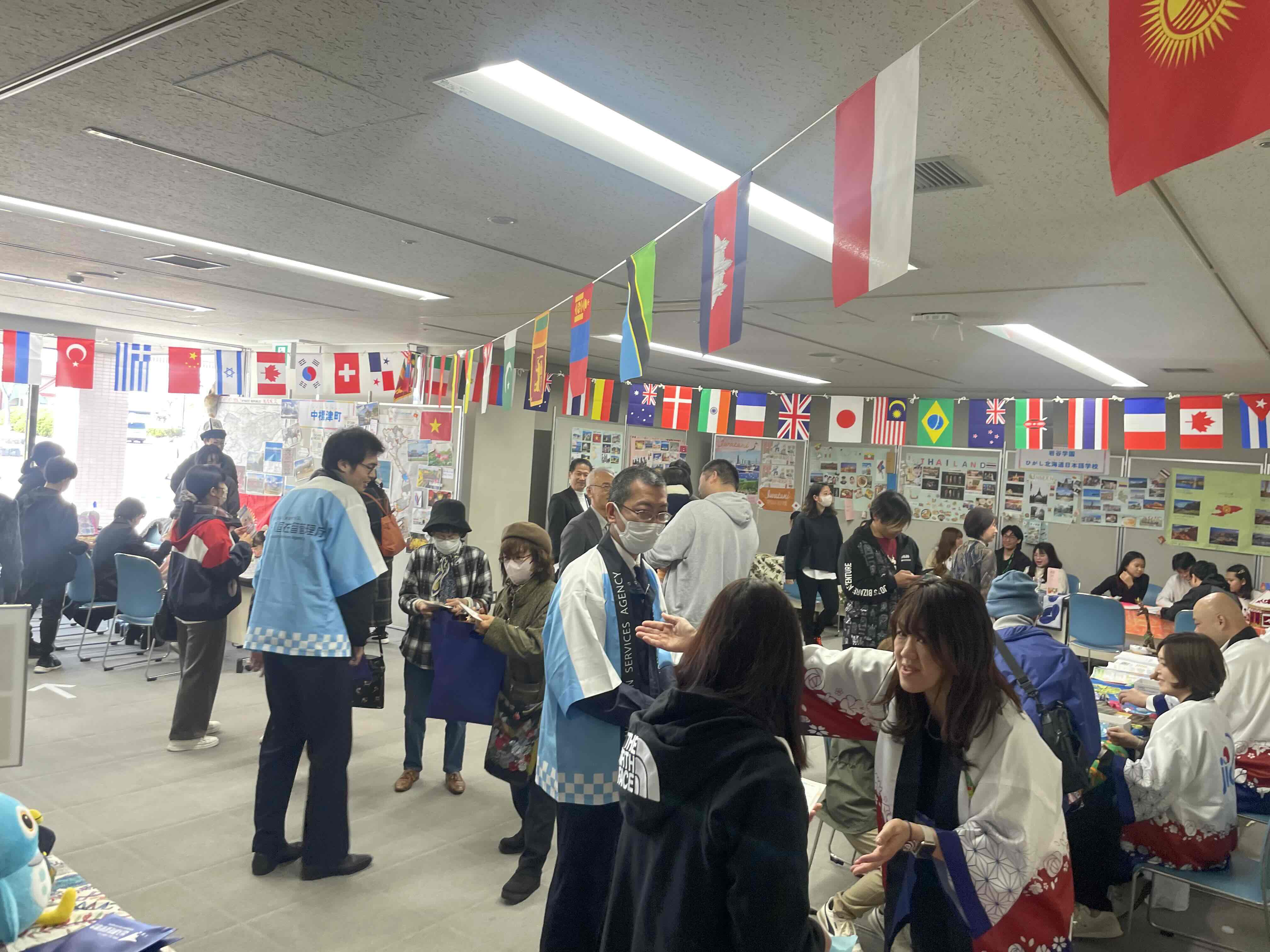 会場にはいるとJICAブースのほか、中標津町、入管(札幌出入国在留管理局釧路港出張所)、岩谷学園ひがし北海道日本語学校、根室振興局がそれぞれブースを設け、体験プログラムや展示プログラムが用意されました。