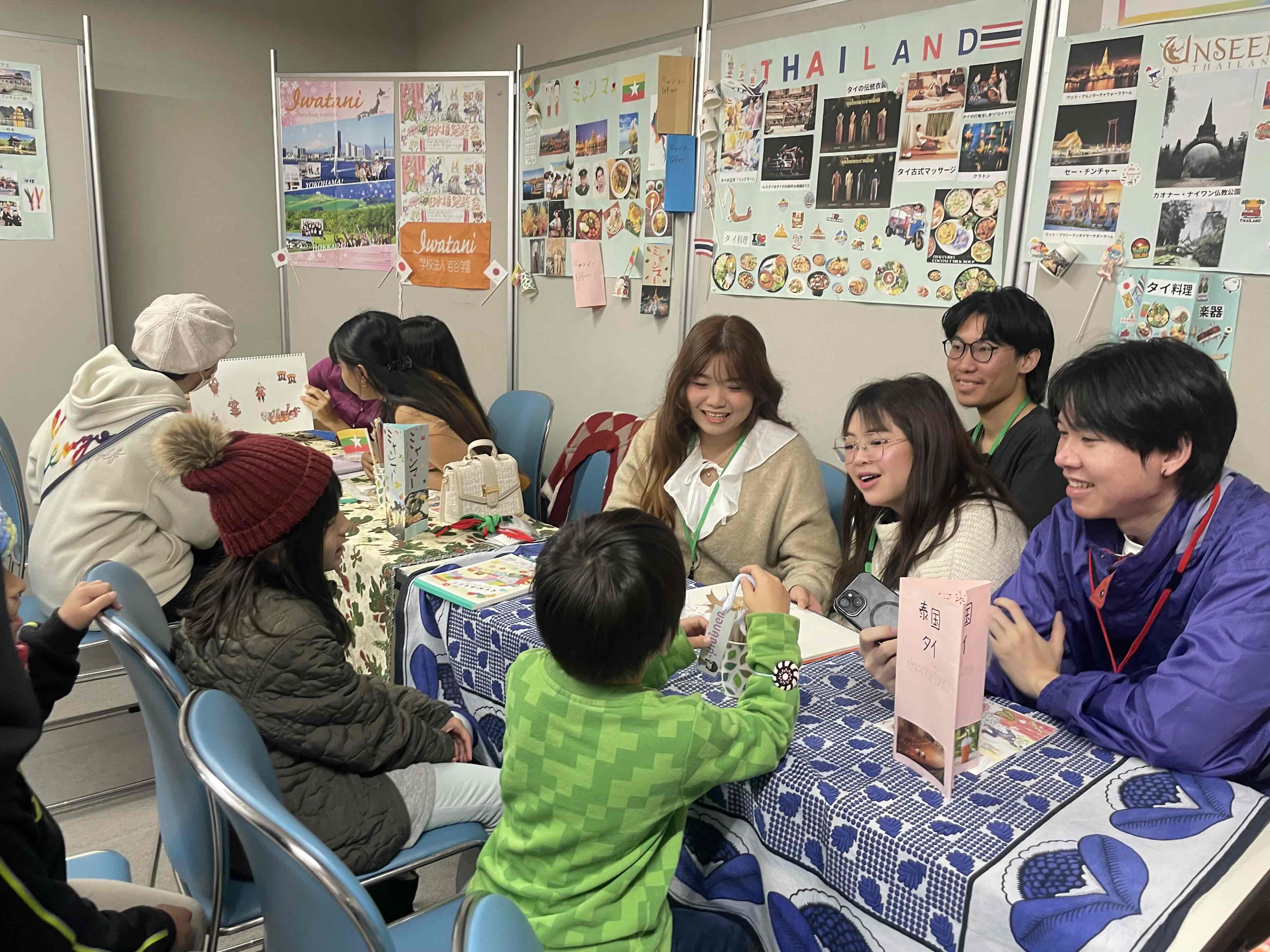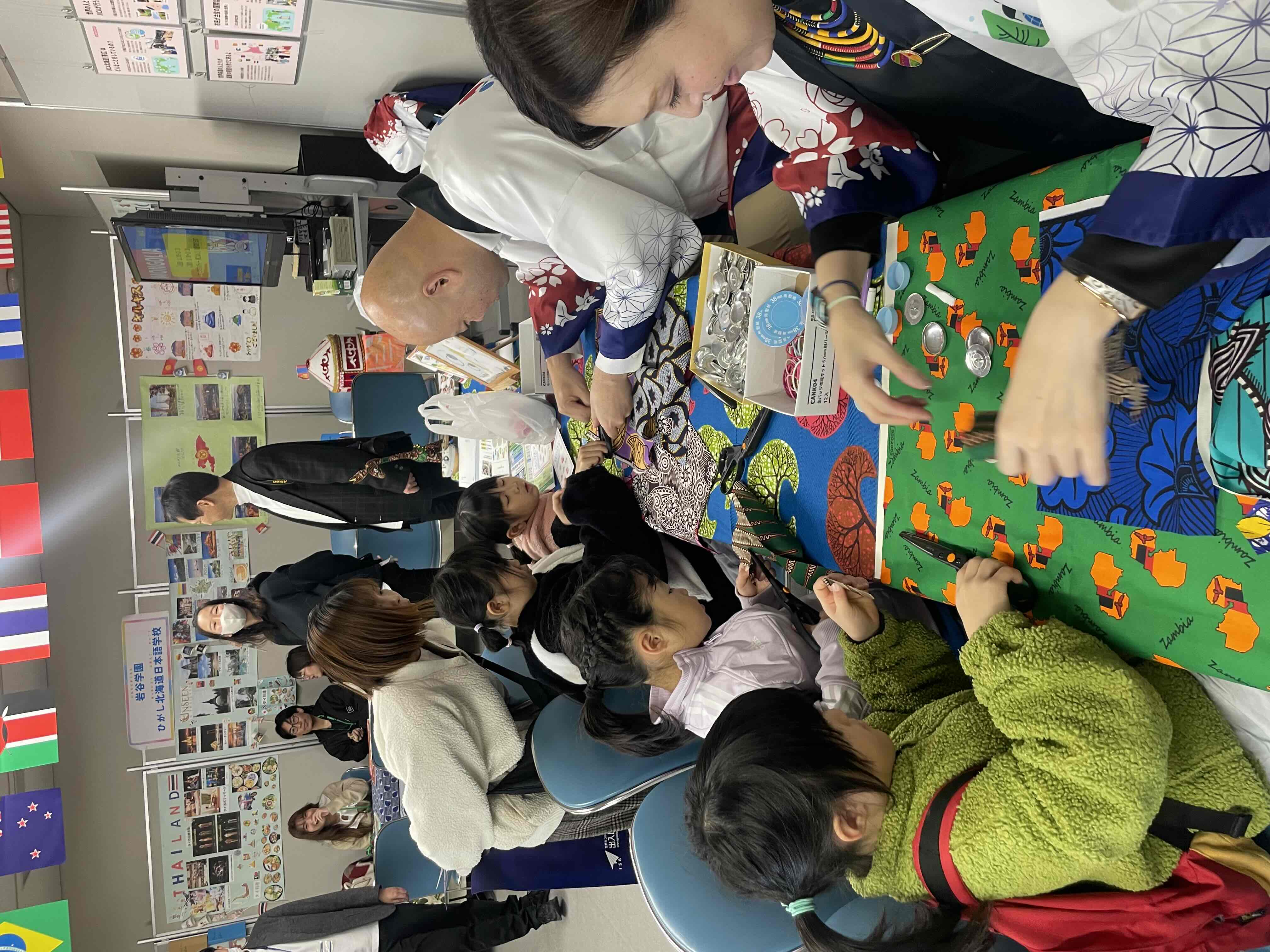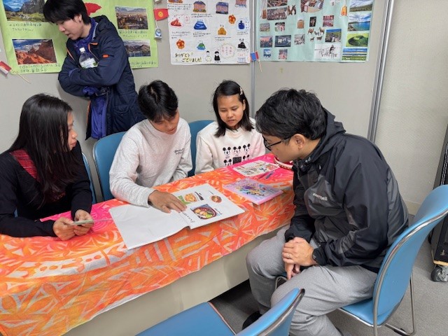 岩谷学園ひがし北海道日本語学校ブースでは留学生による7か国の文化紹介やクイズなどを通じて留学生と対面で交流できる体験が行われ、留学生が着用する民族衣装に子供たちが「綺麗だね」と声をかけ、笑顔で交流をしていました。
