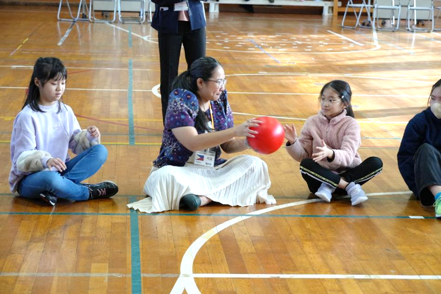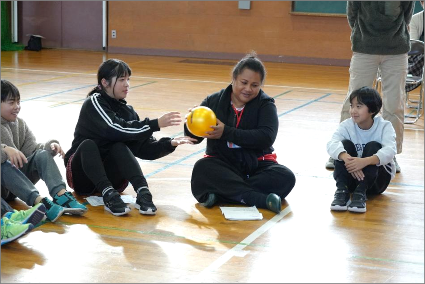 アイスブレイクではインタビューゲームをし、音楽が鳴っている間は隣の人にリズムよくボールをパス。音楽が止まった時にボールを持っている人が英語で好きな色や食べ物などを質問しました。簡単な動きと言葉を使うゲームは児童と研修員が仲良くなれるきっかけになりました。