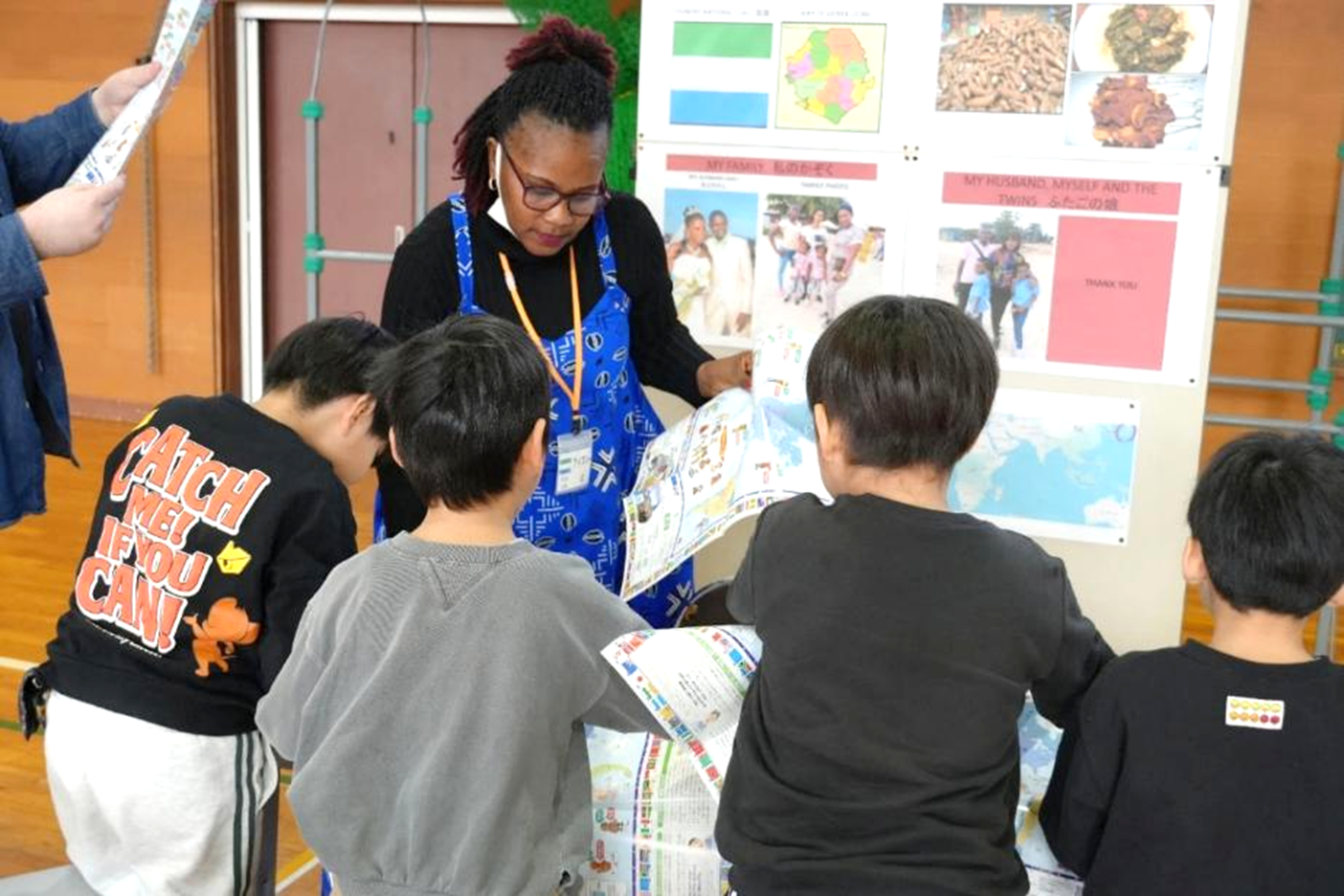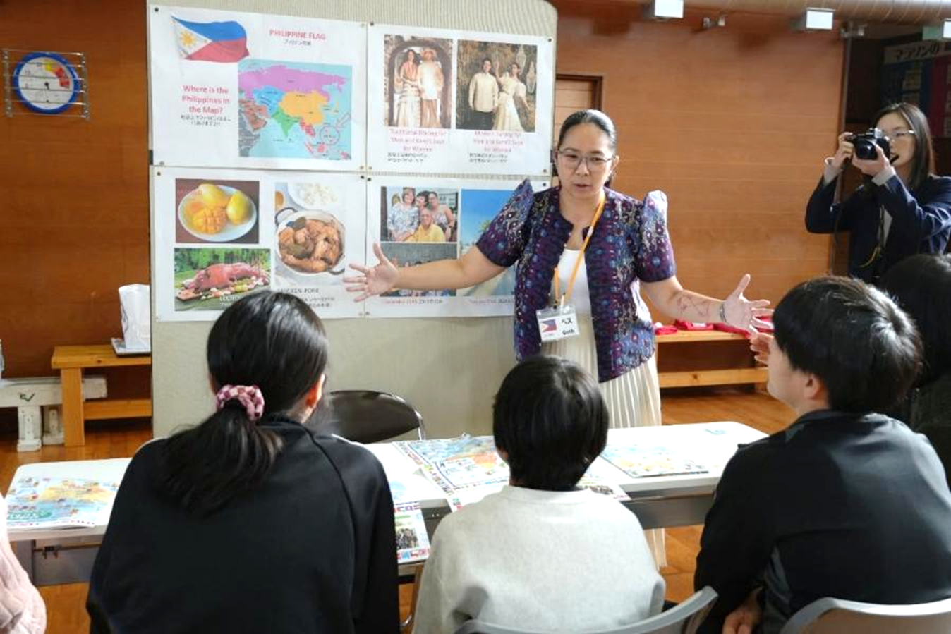 その後はグループに分かれて研修員が出身国の文化を児童に紹介しました。児童は地図を片手に研修員の出身国の位置を確認し、各国の食や民族衣装について学びました。研修員のベスさん(フィリピン)のブースでは、女性と男性の民族衣装の歴史や違いが紹介されました。児童はベスさんが身にまとっていたバロット・サヤ(女性用民族衣装)に触れて、「思ったより硬い!」などと素材に興味津々の様子でした。