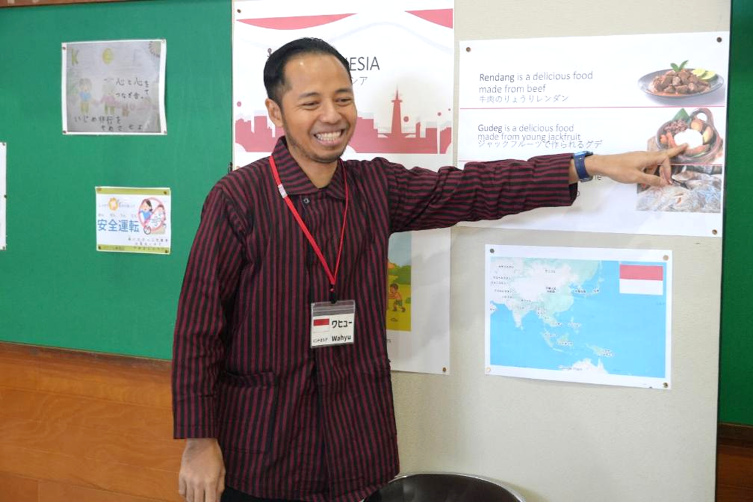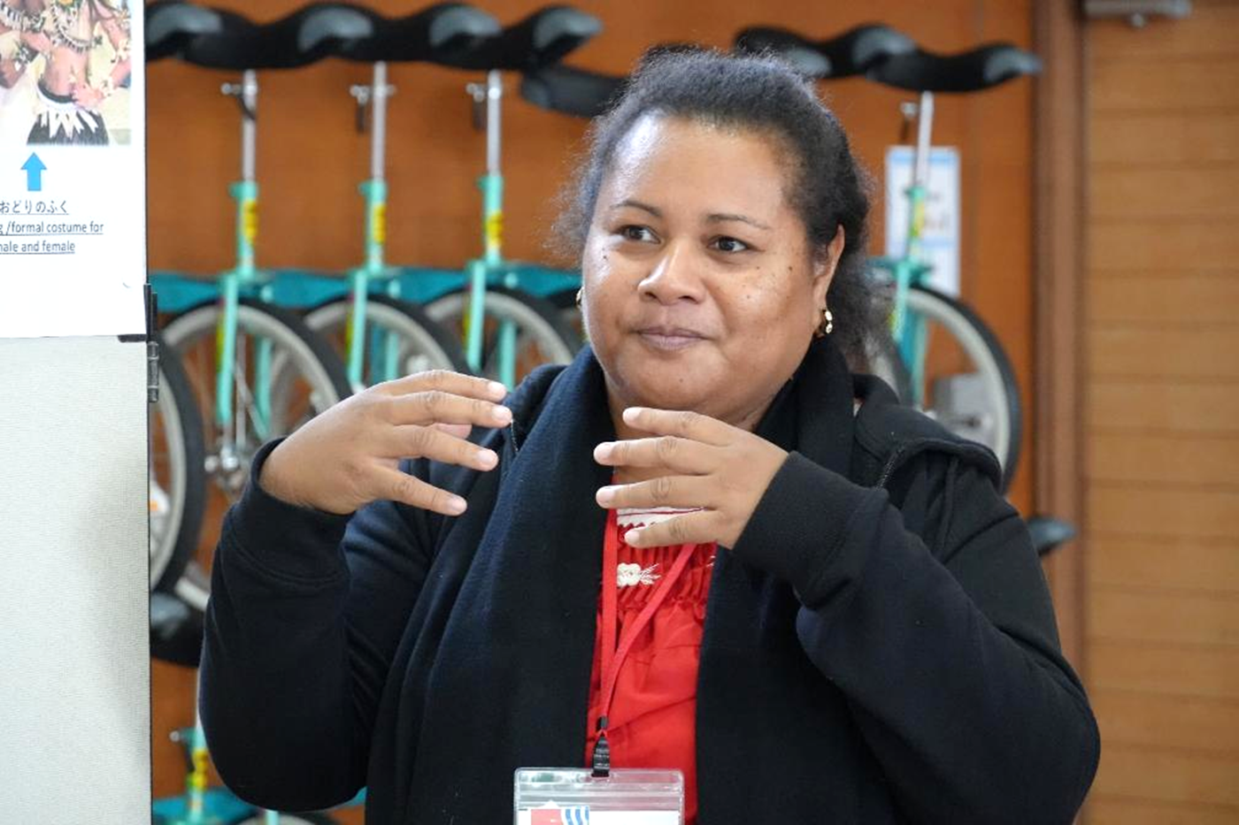 校舎内は研修員の出身国の国旗やウェルカムメッセージが添えられた装飾が施され歓迎ムード満載。歓迎会では、全校で取り組む一輪車が披露され、研修員は初めて見る一輪車の技に大興奮。児童が技やポーズを決められた時は拍手喝采で「素晴らしい!」と連呼する研修員もいました。