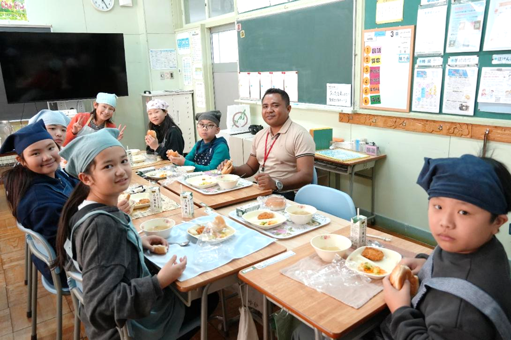 お楽しみの給食交流では、研修員も児童と一緒に給食を食べました。研修員は、副菜のバリエーションや全体の色味、たんぱく質やビタミンなど細かな栄養バランスが配慮されたメニューに感動。