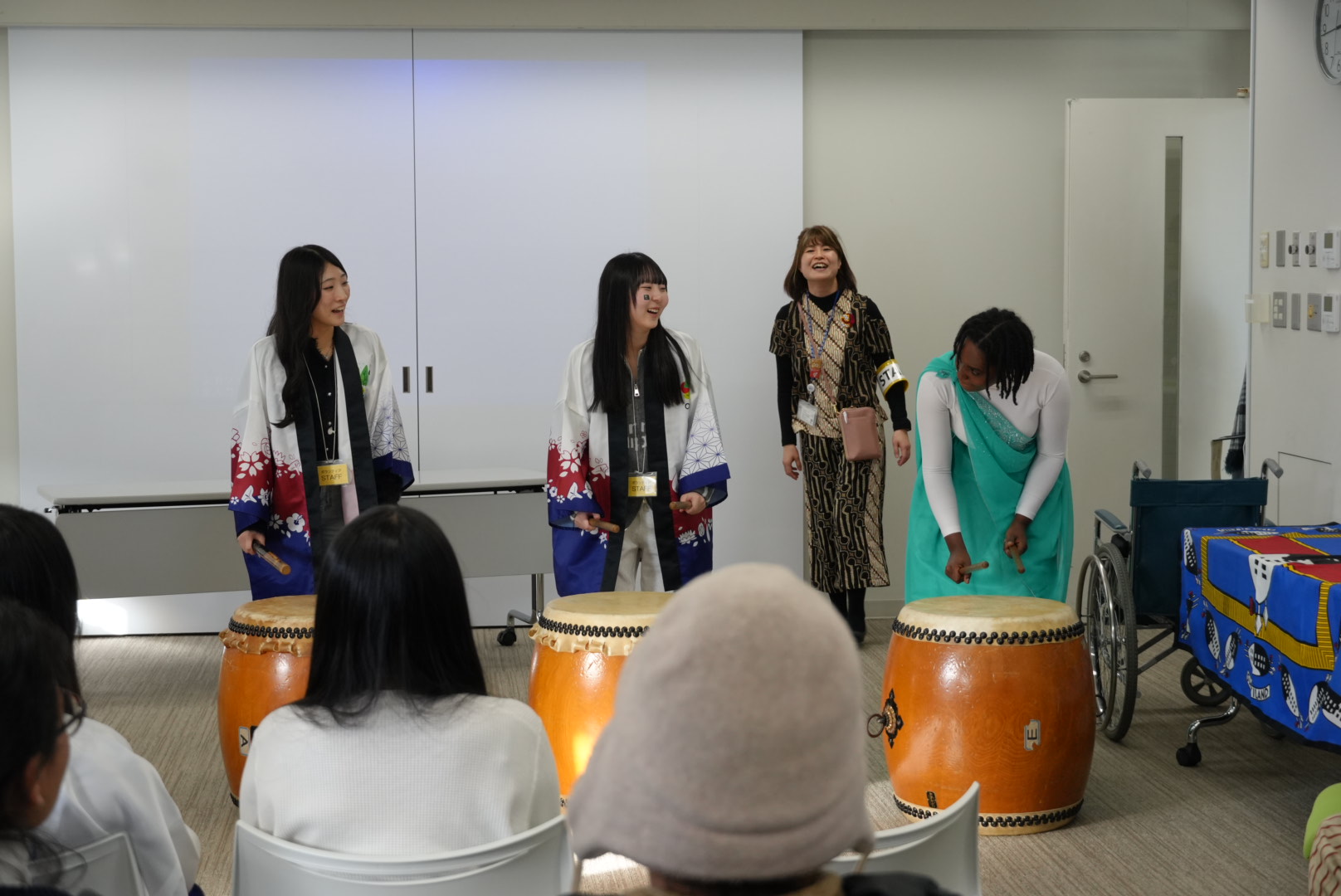 また、帯広三条高校生による和太鼓セッションでは、来場者、高校生、留学生が一緒に太鼓を演奏し、言葉だけでないコミュニケーションをしました。