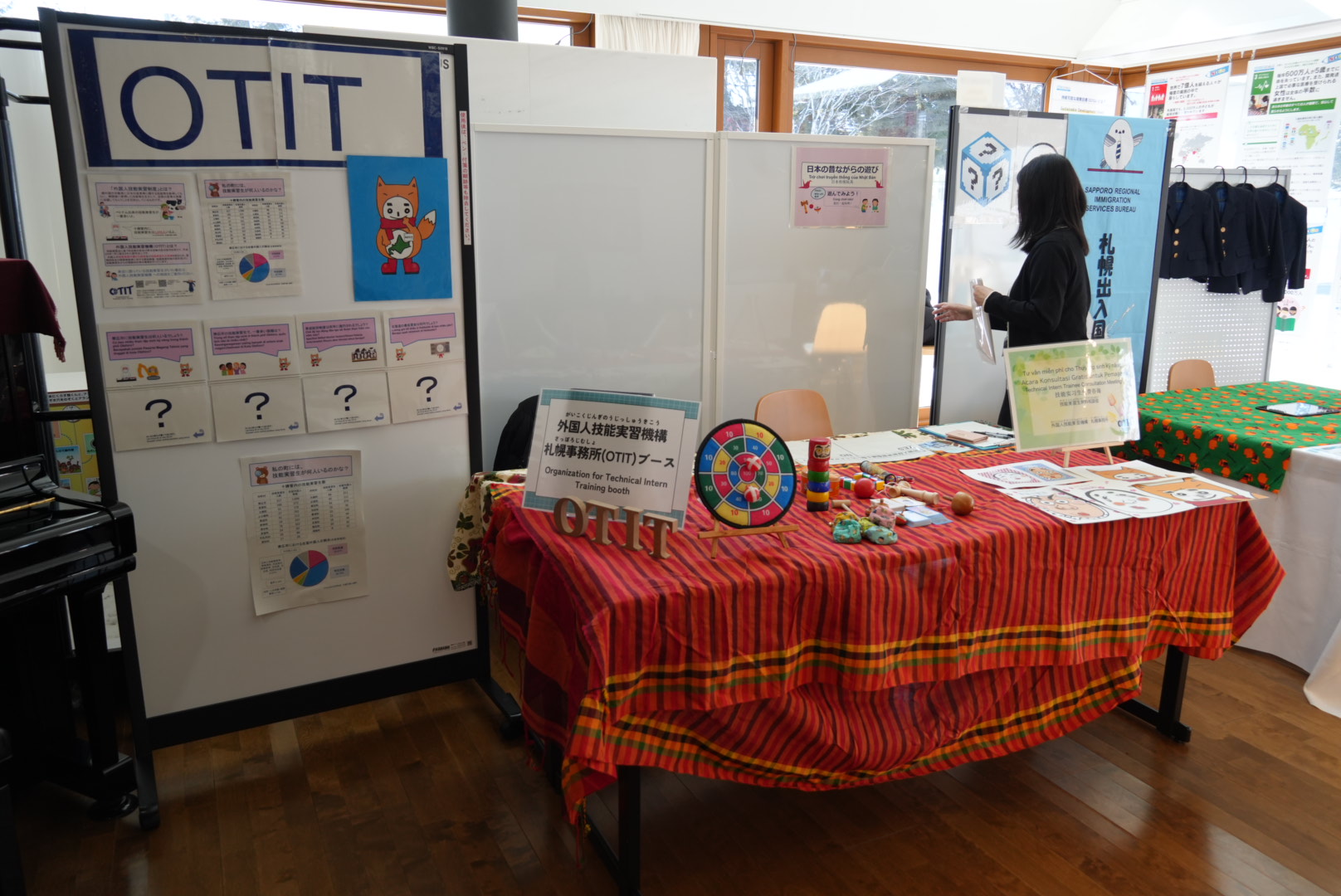 「入管」「OTIT」の役割や在住外国人についてのクイズ、日本の昔ながらの遊びが体験できるブースを出展いただきました。