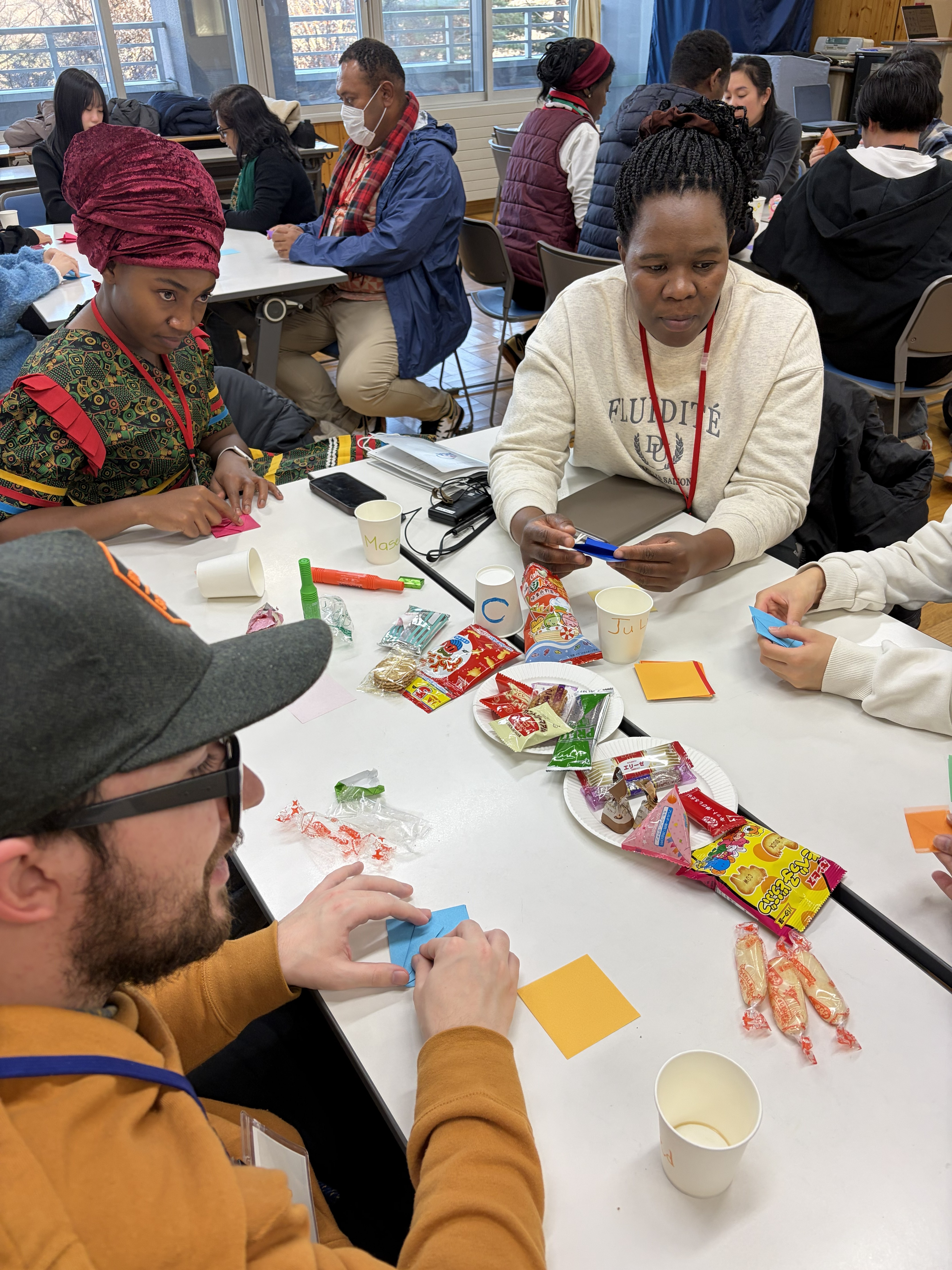 次は日本文化体験として折り紙。JICA研修員は生徒に教わりながら、鶴や飛行機を折り、すっかり夢中になりました。