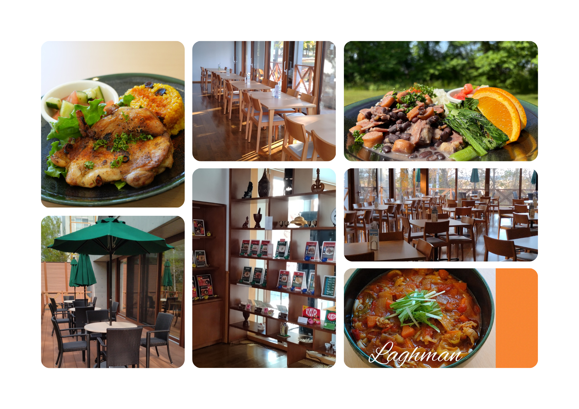 「おびくっく」は、当施設で研修中の海外からの研修員だけではなく、一般の方々もご利用いただけます。 にぎやかな鳥のさえずりを聞きながら、ランチやディナーはいかがですか。春はたんぽぽが咲きみだれ、夏はテラス席から木々を眺めているとエゾリスがやって来ることもあります。リーズナブルな価格で国際色豊かなメニューを用意しておりますので、ぜひご利用ください。