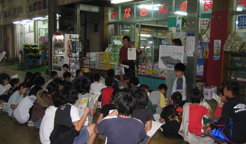 中心市街再生の取り組みを地元小学校の生徒へ説明する金城さん