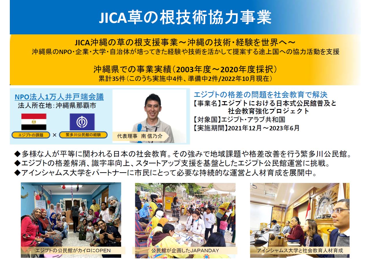 実施団体である特定非営利活動法人1万人井戸端会議は、現在那覇市繁多川公民館を運営しています。南信乃介代表理事の報告によると、それまで海外での事業経験がなかった同団体は、2012年にエジプトから来た一人の青年と出会ったことで、日本の公民館がエジプトの教育に役立つことを知り、その後さまざまな形でエジプトでの公民館普及に努めてきたとのことです。2021年から開始した草の根技術協力事業では、公民館を運営できる人材を37名養成するという大きな成果を得ることができました。更に今後は、本事業で協力を得ていたエジプトのアインシャムス大学とエジプト公民館が協力し、公民館運営人材の資格認定制度のコースを同大学内に設置することを検討中とのことです。