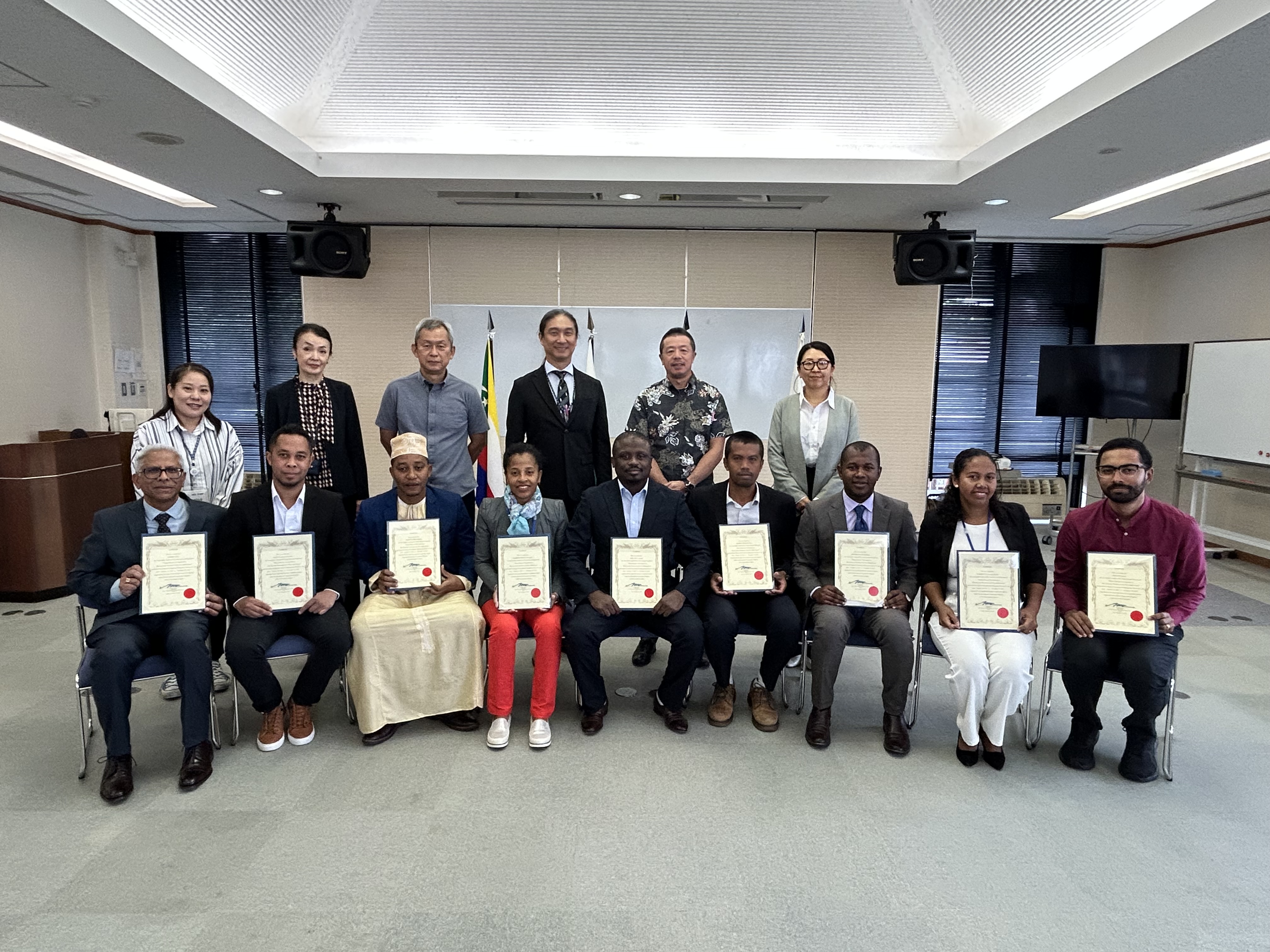 国別研修「西インド洋地域ブルーエコノミー推進人材育成」コースの閉講式が11月28日に行われ、マダガスカル、コモロ、モーリシャスからの研修員9名が無事にコースを修了しました。