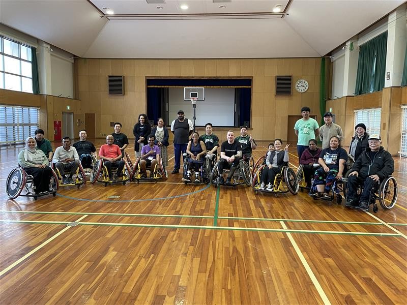 4月は6か国、9名の研修員が沖縄で学んでいます。写真は2025年度課題別研修「地域に根ざしたインクルーシブアプローチによる障害者の社会参加(B)」コースで行った、車椅子バスケットボール体験の様子です。