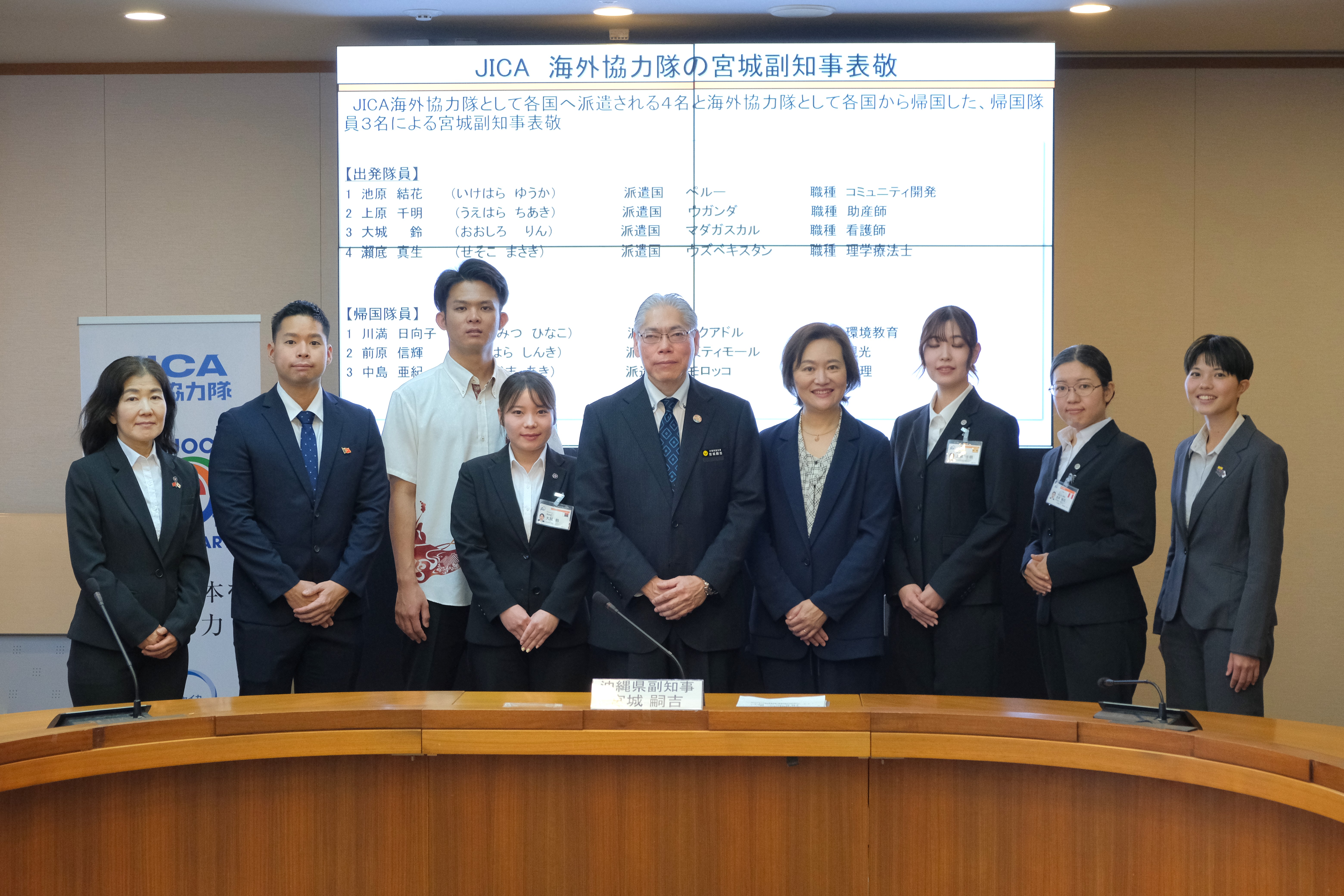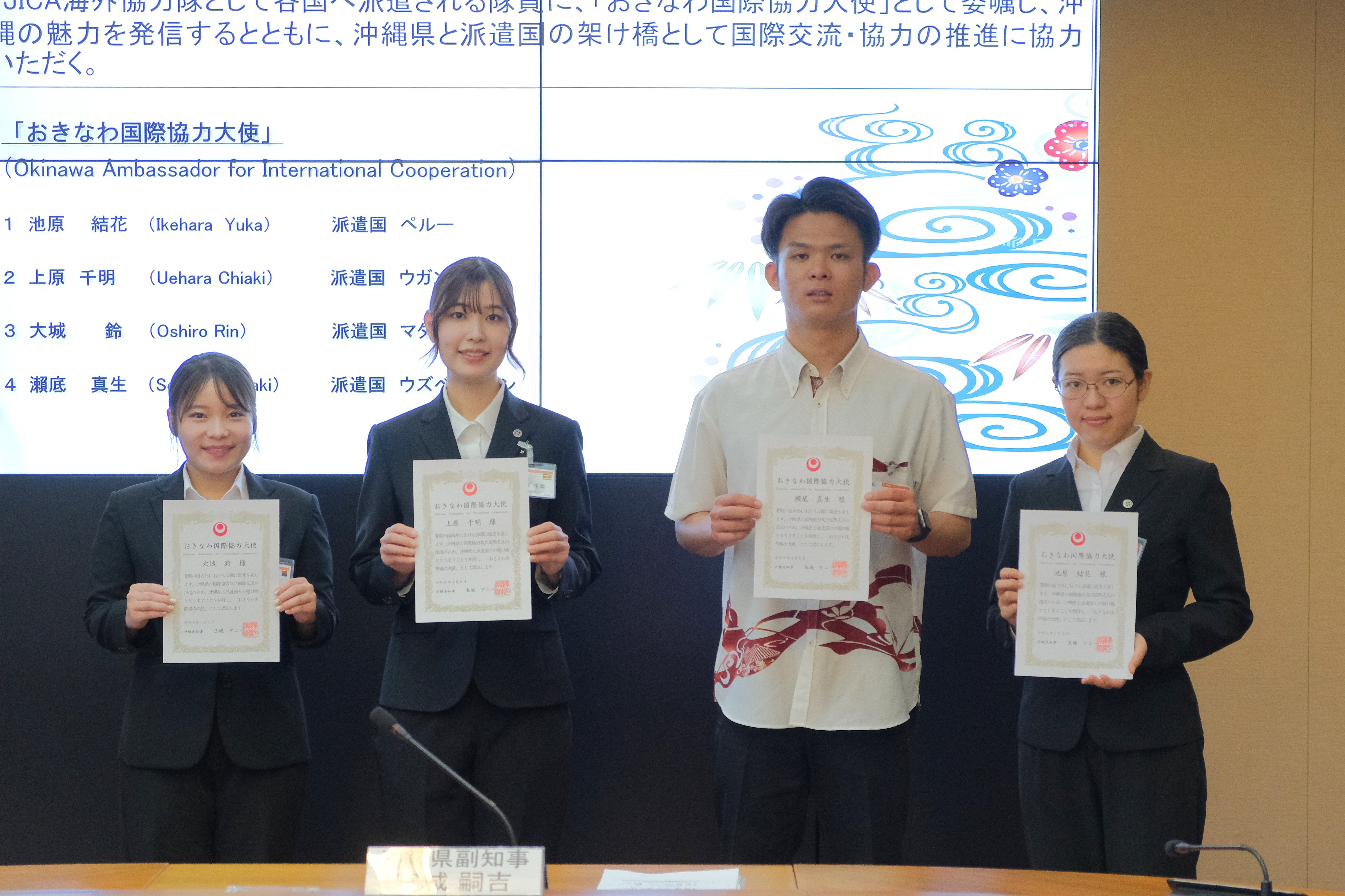 JICA海外協力隊は、開発途上国や中南米の日系社会からの要請に基づき派遣され、現地の人々と協力しながら、約2年間にわたり各国・地域が抱える課題の解決に取り組んでいます。当日は、出発隊員4名が派遣先で予定している活動内容やそれぞれの抱負を述べ、帰国隊員3名は、派遣期間中の2年間にわたる活動について報告しました。宮城副知事からは、異国の地での経験は人生の大きな財産となるとコメントをいただき、これから出発する隊員へは激励の言葉が、帰国隊員へは活動への感謝と労いの言葉が贈られました。また、出発隊員4名は「おきなわ国際協力大使」に任命され、宮城副知事より任命状が手渡されました。