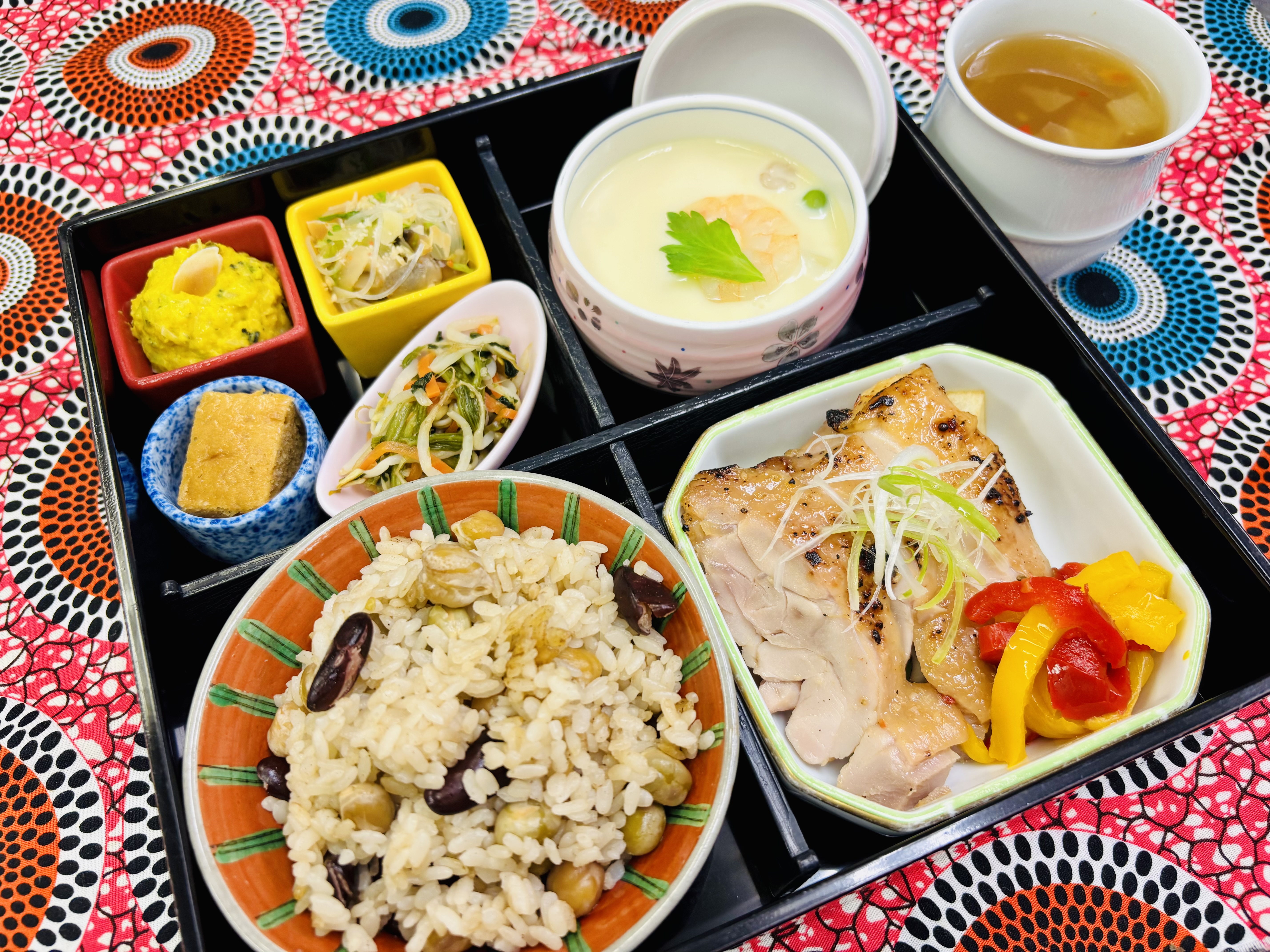 旬の野菜を詰め込んだ秋の幕の内は、20種類の野菜と多国籍料理を組み合わせたOIC食堂ならではの一品!
