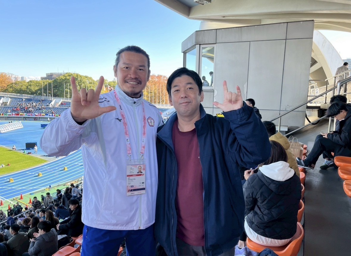 デフリンピック陸上会場にて、台湾チームのコーチと。