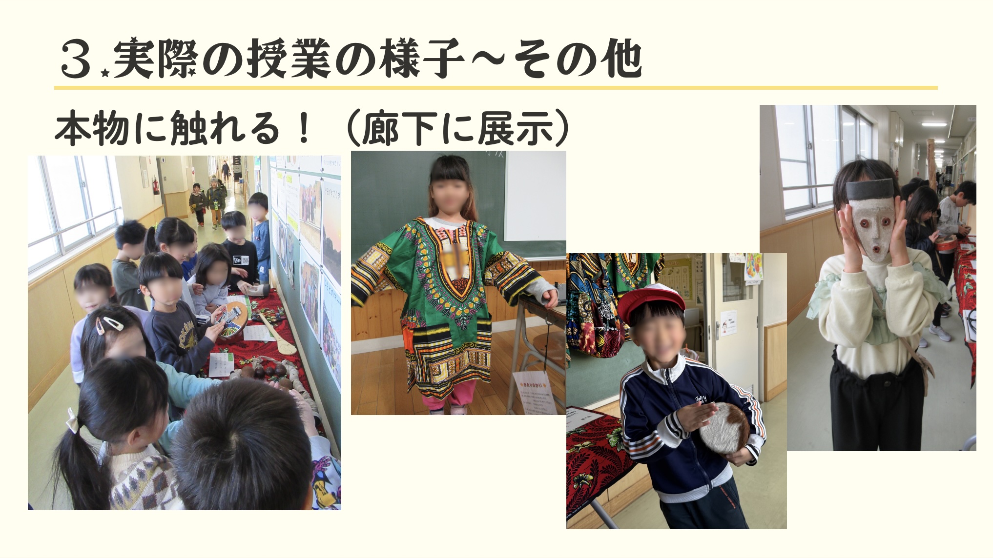 帰国後、小学1年生を対象に授業実践をしました。まだ「外国」や「日本」という概念をはっきりもっていませんが、ザンビアの文化に触れることを通して、「外国っておもしろそう」「行ってみたい」「友達をつくってみたい」、そんな国際理解の第一歩を踏み出せるような授業を意識しました。