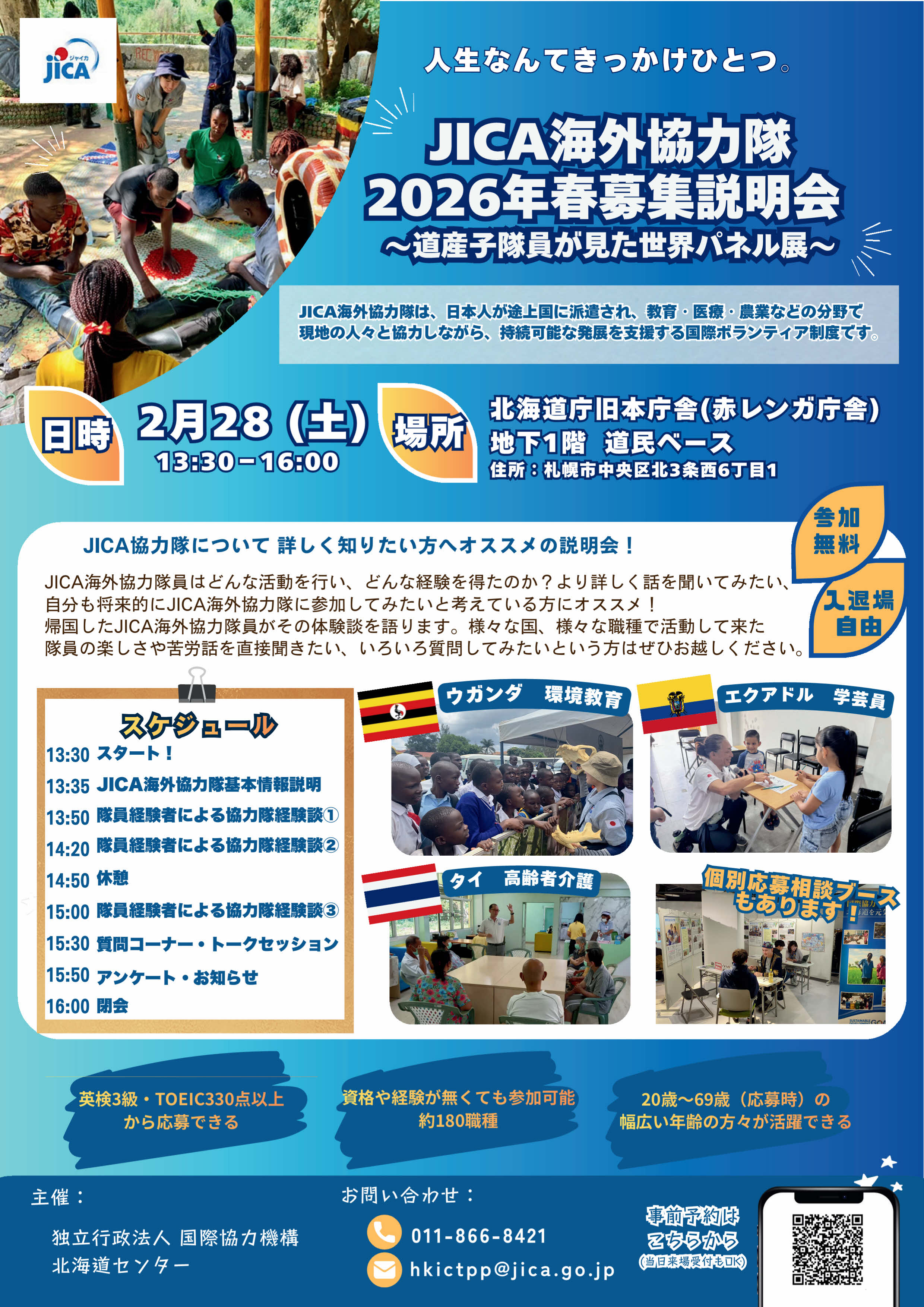 2月28日(土)に北海道庁赤れんが庁舎にて、JICA海外協力隊2026年春募集説明会を開催します!
